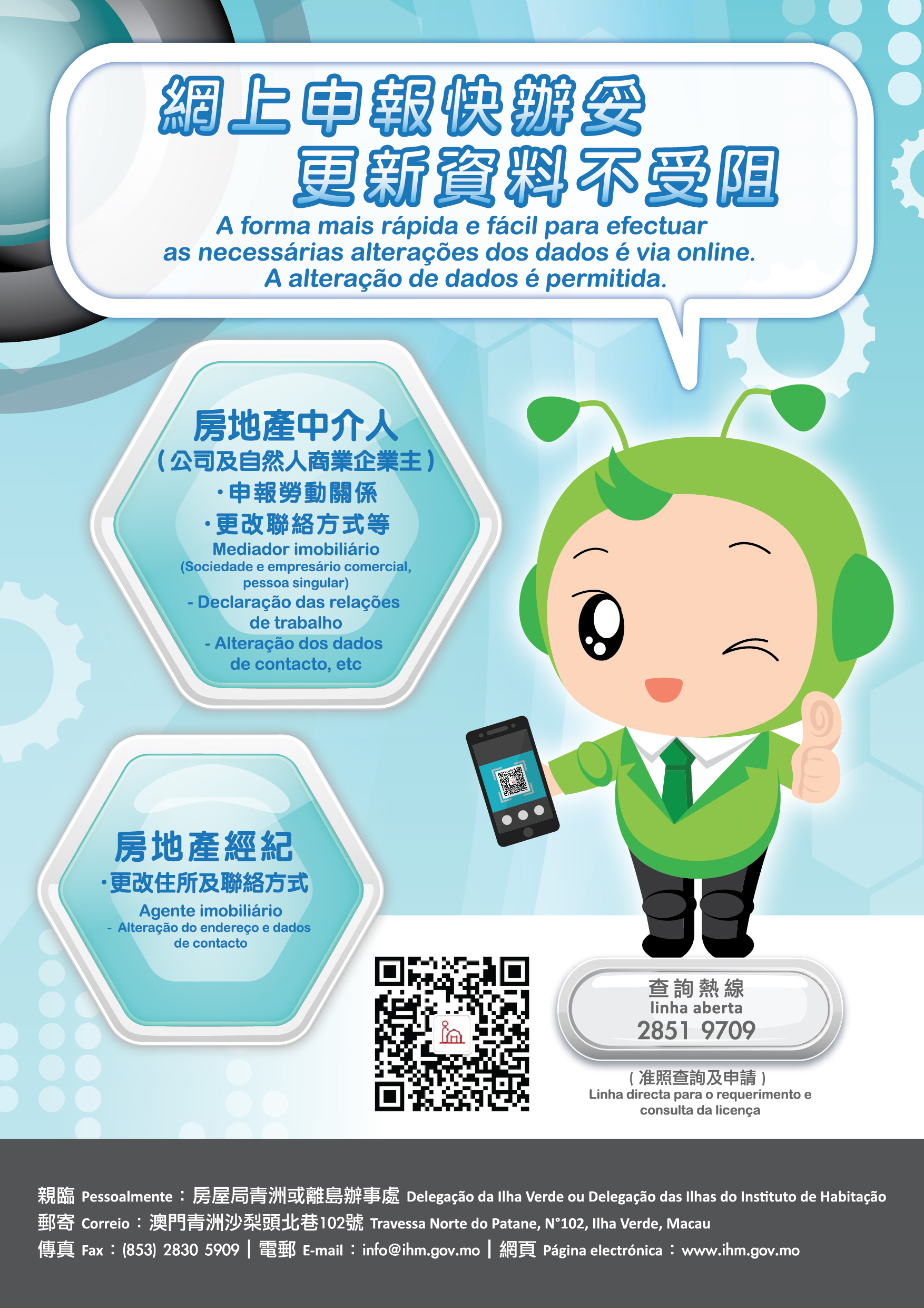 是次新增的網上申報及更改資料服務包括:房地產經紀准照更改住所及聯絡方式;房地產中介人准照(自然人商業企業主)申報增設網址、勞動關係變更通知,以及更改聯絡方式;房地產中介人准照(公司)申報增設網址、公司合同或章程變更、機關據位人變更通知、勞動關係變更通知,以及更改聯絡方式。