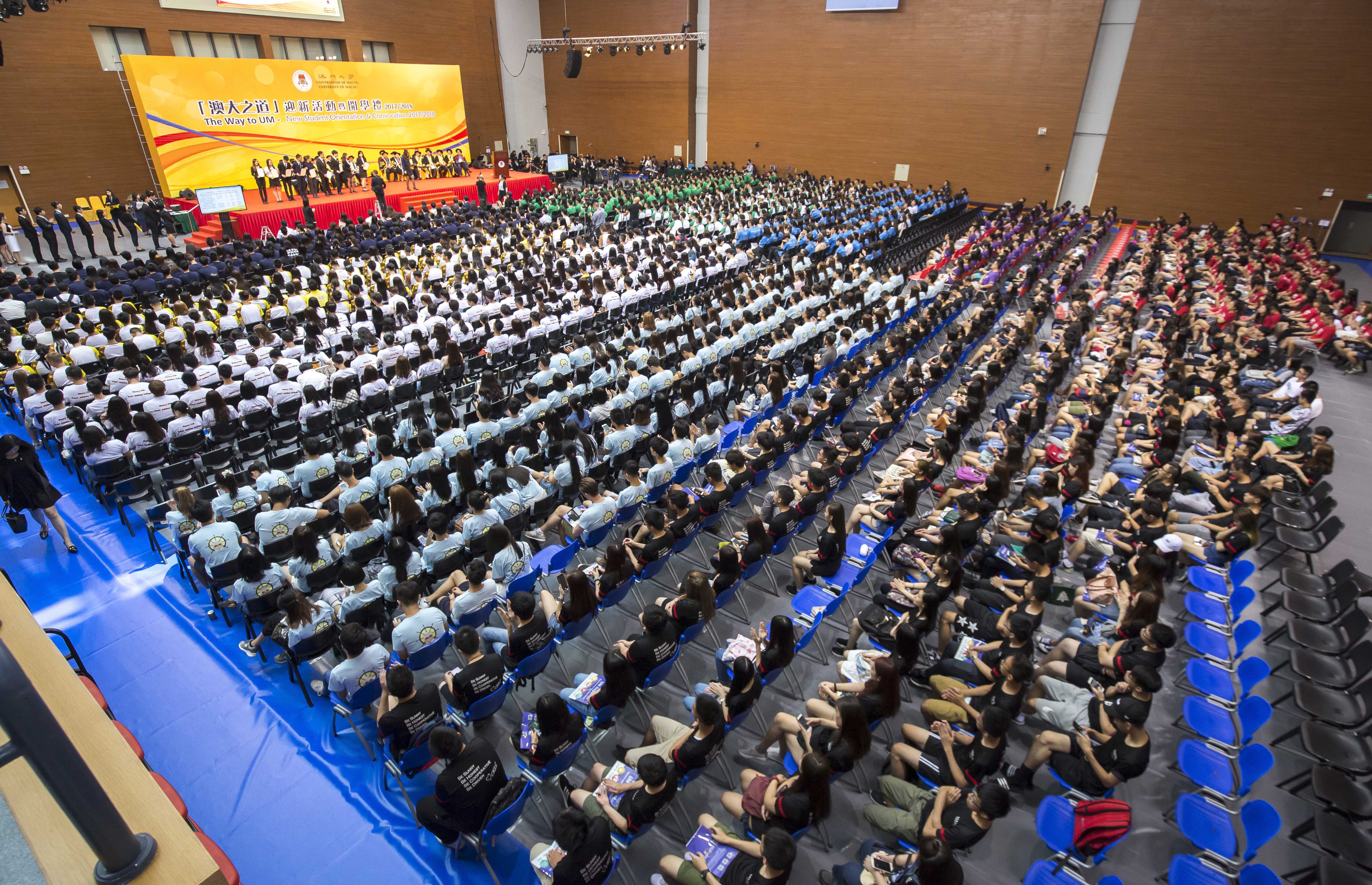 澳門大學今(15)日舉行2017/2018學年新生迎新會及開學禮,逾一千七百名新生與教師共聚一堂迎接新學年、新生活。澳大校長趙偉向新生講了第一堂課,勉勵學生求取學問同時,也不忘品德修養,更要善用大樓大師,宏揚大博大雅的精神,成為能適應21世紀變遷的人才。