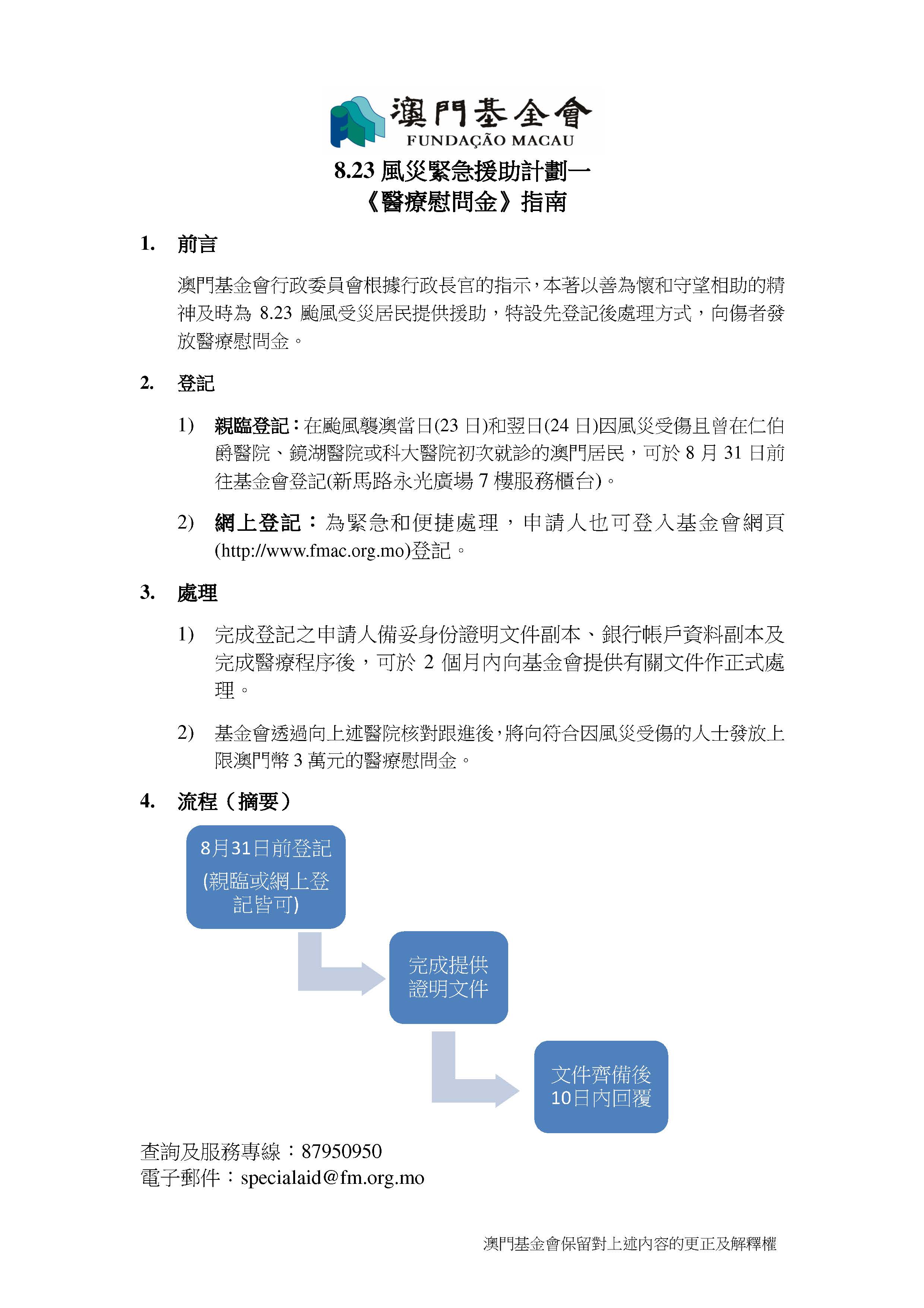 澳門基金會呼籲“家居修復援助金”及“醫療慰問金”的申請者仔細了解申請流程,並於澳基會網站先行登記,無須急於親身前往申請。為方便市民了解及辦理登記,澳基會將於本周六日 (8月26日及27日)照常辦公,中午不休息。澳基會再次提醒市民,醫療慰問金的申請截止日期為8月31日,家居修復援助金的申請截止日期為9月30日。查詢電話:8795 0950