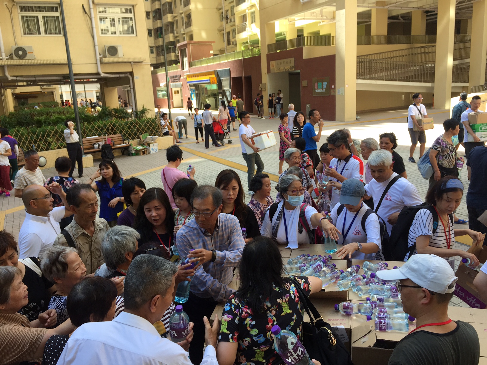房屋局今(26日)組織近400名義工向石排灣、氹仔、青洲、筷子基等多座社會房屋向受颱風影響的8000多戶社屋居民派發發近3萬支樽裝水,650包餅乾及500個飯盒,勸喻住戶及早做好防風準備。