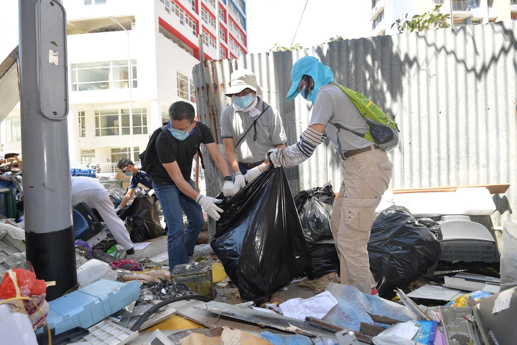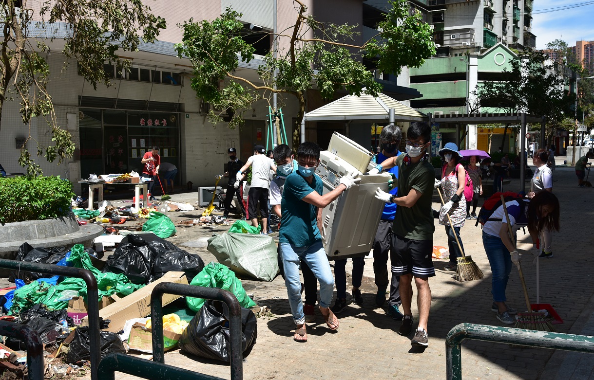 民署今早協調各公務員義工隊伍,分別到司打口、內港、爐石塘、沙梨頭、筷子基、青洲及黑沙環等一帶協助清理垃圾及雜物,以及派發垃圾袋等物資。行政法務司司長陳海帆聯同公務員義工隊伍由司打口公園出發,前往安仿西街、夜姆街、蓬萊新街等一帶,沿途一起協助清理受水淹浸店舖棄置的垃圾,並合力將垃圾用膠袋包好,送上收集垃圾的貨車。
