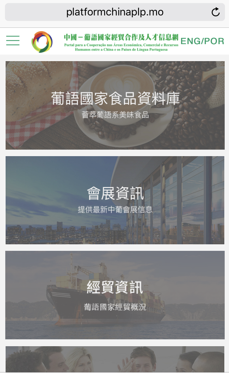 信息網的手機版設中文、葡語、英語三種語言,客商可以更加便捷地瀏覽葡語國家最新資訊。歡迎有意或已從事中國與葡語國家貿易的企業、葡語國家食品供應商、專業服務供應商、中葡雙語人才到 www.platformchinaplp.mo註冊成為用戶,以及瀏覽信息網了解最新商情和資訊,拓展商機。