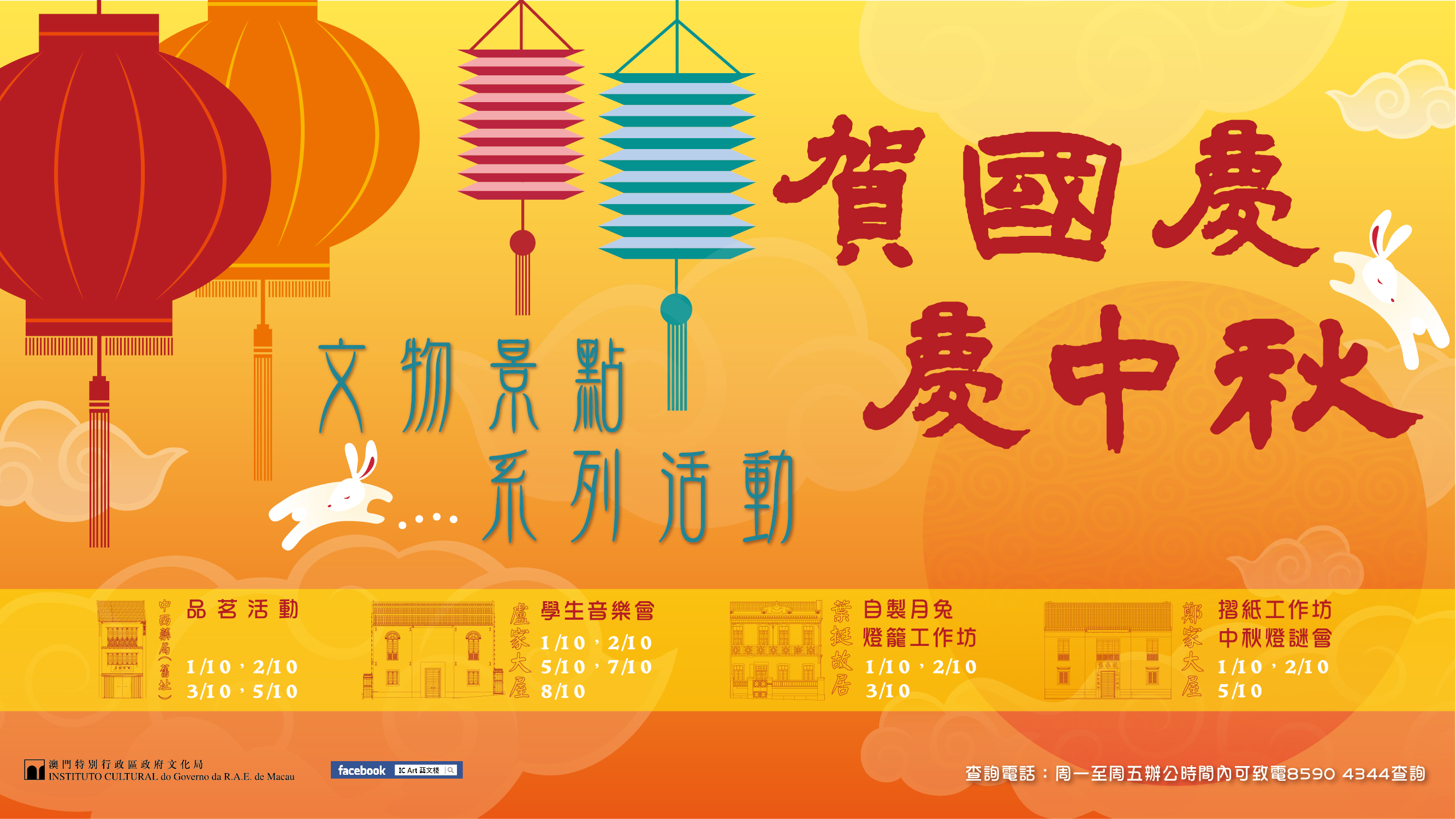 為慶祝國慶及中秋佳節,文化局鄭家大屋、盧家大屋、中西藥局舊址及葉挺將軍故居將分別於十月一至八日期間,舉辦“學生音樂會”、“中秋燈謎會”、“品茗活動”及“自製月兔燈籠工作坊”等活動,為傳統節日增添喜慶氣氛,歡迎居民及遊客參加,費用全免。