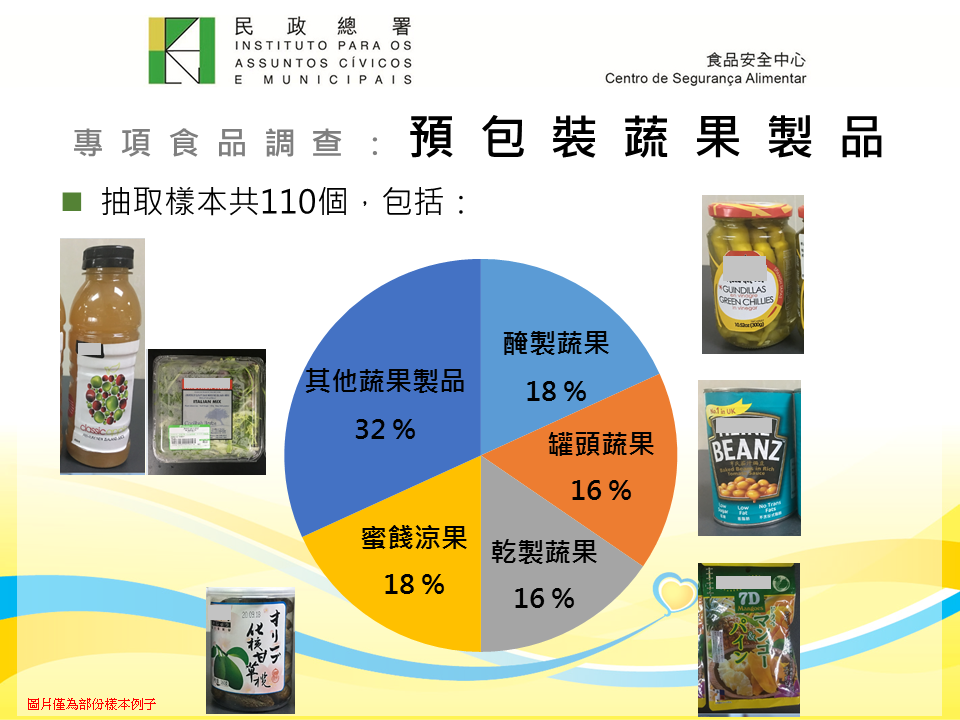 為瞭解本澳市售預包裝蔬果製品的食用安全情況,民政總署食品安全中心開展專項食品調查,於市面抽取預包裝蔬果製品共一百一十個樣本,進行了重金屬和食品添加劑含量檢測,結果顯示所有抽檢樣本均未見異常。
