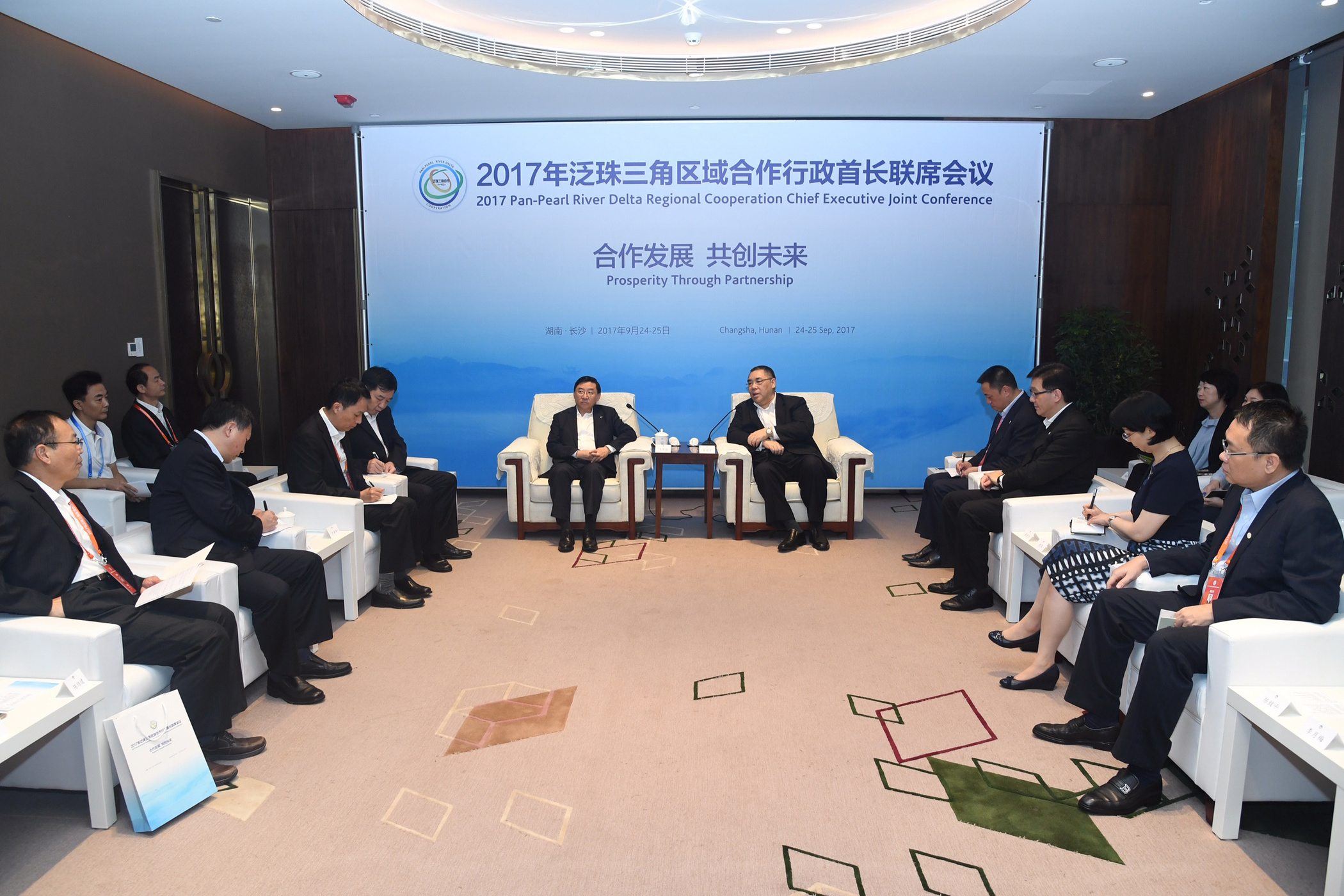 行政長官崔世安今(24)日前往湖南長沙,與共同出席2017年泛珠三角區域合作行政首長聯席會議的福建省省長于偉國會面,雙方就閩澳共同參與“一帶一路”,以及深化旅遊、會展合作等議題交換意見,冀加強合作力度。
