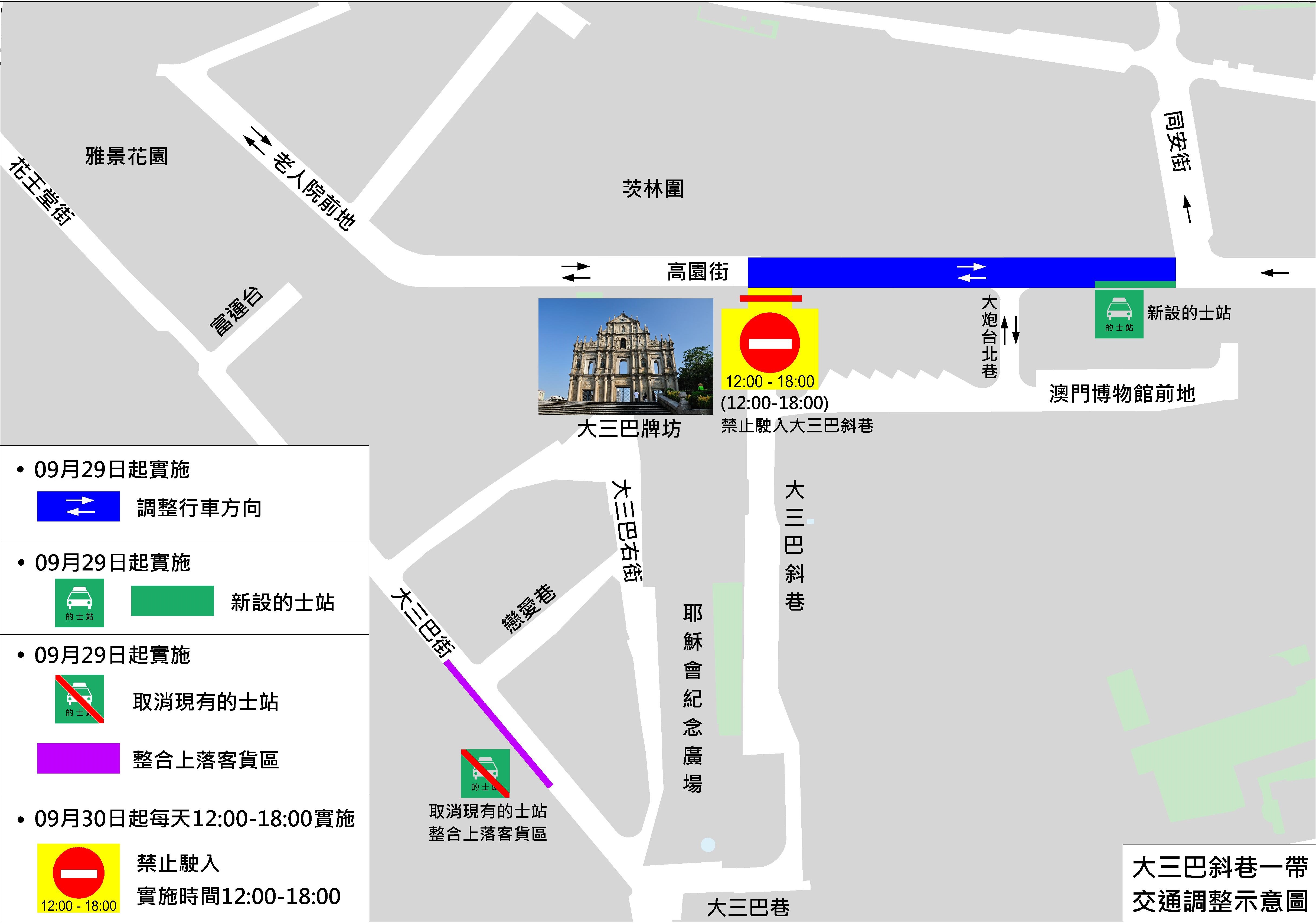 現時往來耶穌會紀念廣場的行人眾多,而國慶假期為本澳其中一個訪澳旅客高峰時期,為更有效疏導大三巴的人流,治安警察局將可能在此期間實施人潮管制措施;為配合相關安排及改善耶穌會紀念廣場前的行人安全問題,9月30日(周六)起,大三巴斜巷每日中午12時至下午6時實施封閉交通;9月29日(周五)起,介乎大三巴斜巷與同安街之間的一段高園街改為雙向行車,部分輕型汽車咪錶泊車位會調整成電單車泊車位及的士站;而大三巴街之的士站則會與其旁邊現有的上落客貨區整合作上落客貨用途。上述地點之標線及標誌整治工作將於9月27日(周三)至9月29日(周五)期間進行。