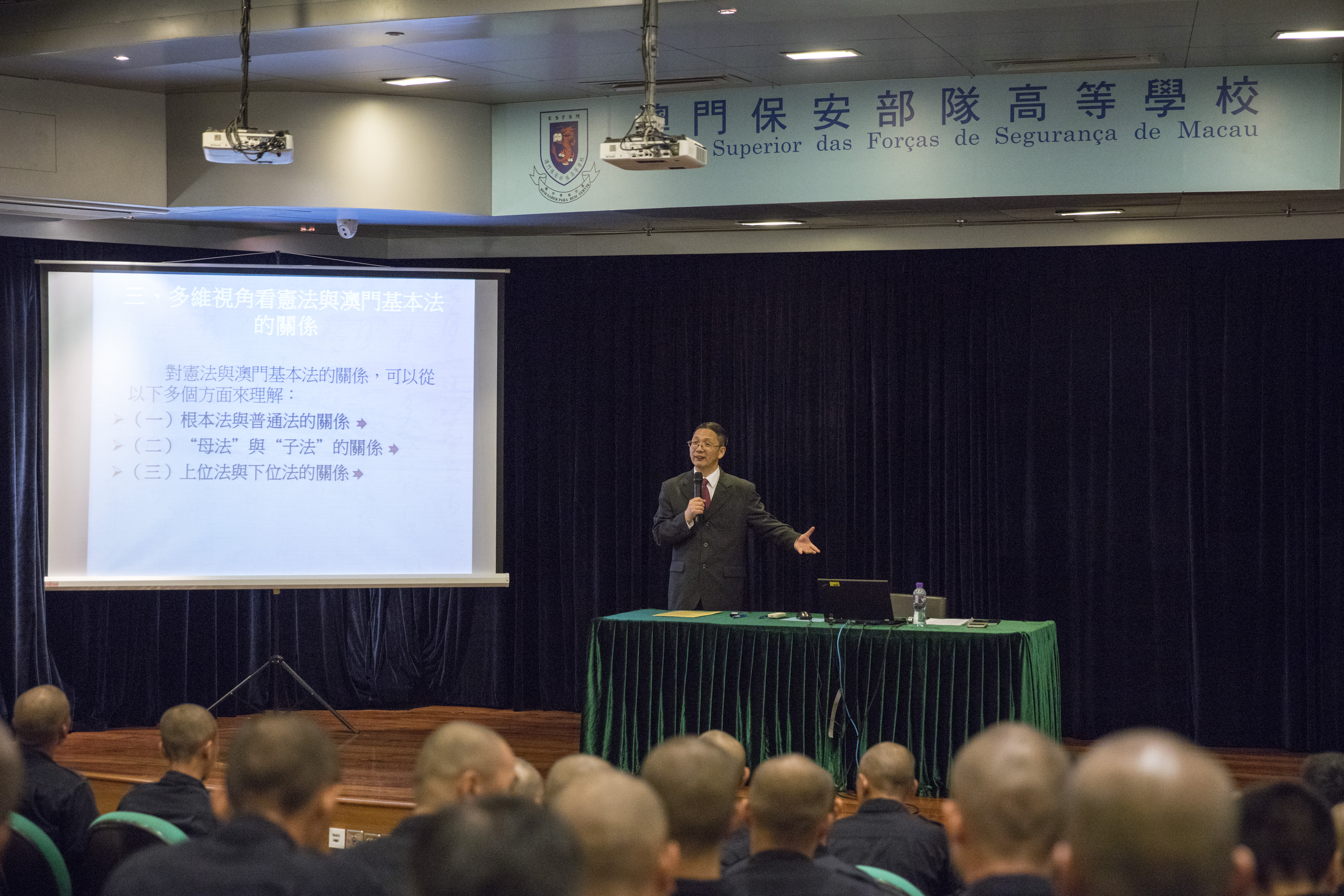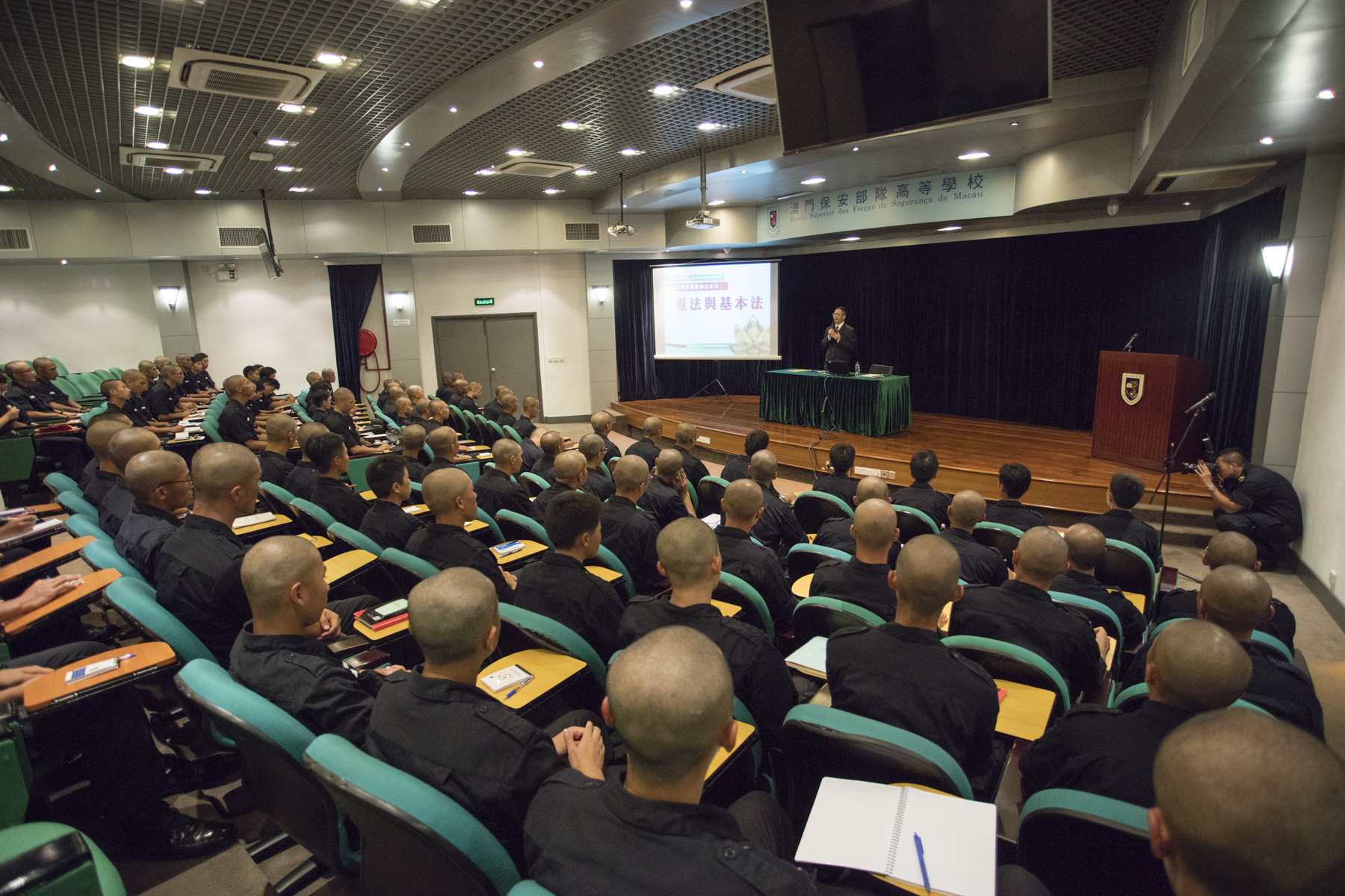 為加強於高等院校推廣國家憲法與澳門基本法,法務局與澳門保安部隊高等學校於九月二十五日續辦本年度第三場高等院校憲法與基本法專題講座及“國是茶聊”小型討論會,邀請澳門理工學院「一國兩制」研究中心主任冷鐵勛博士擔任主講嘉賓。是次活動共有約一百位海關學員參加。