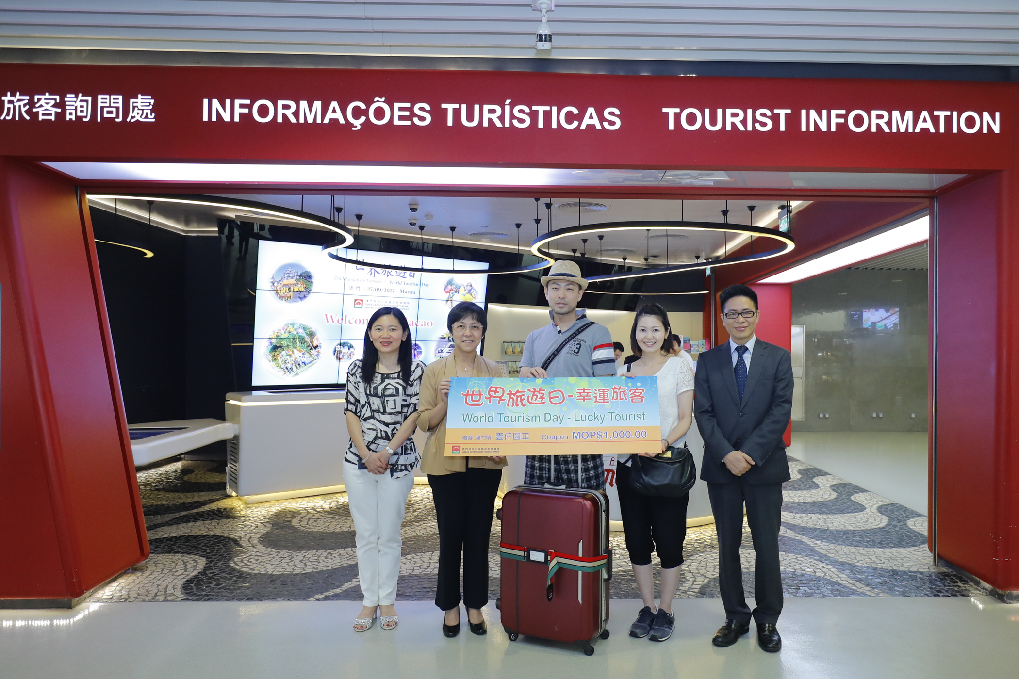 旅遊局領導早上到外港客運碼頭,致送禮品給“世界旅遊日”的幸運旅客,而旅遊局屬下的旅客詢問處全天備有紀念品送贈給旅客。今年的幸運旅客是一對來自日本姓荒川的夫婦,他們是第一次來澳旅遊,留宿一晚,因為從網上知道澳門有著名的世界遺產,所以希望來澳旅遊。除了世界遺產景點外,他們也前往大熊貓館及路氹區觀光。