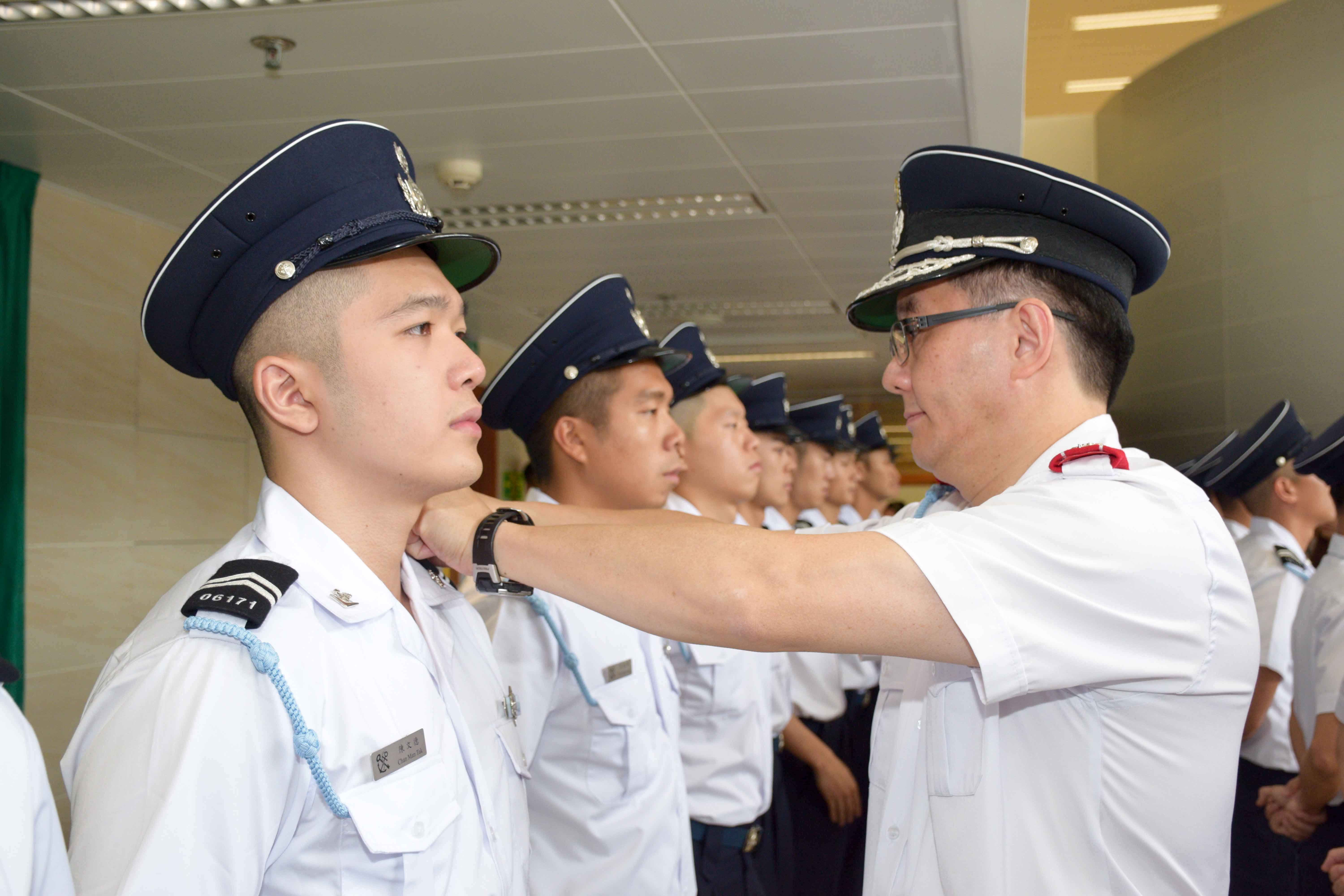 入職儀式由關長黃有力主持,一眾學員於宣誓後,由關長為其戴上肩章,正式成為海關關員。黃有力關長於致辭時,寄語他們未來在工作崗位上要保持無私、熱心之精神,盡力服務市民。黃有力同時又感謝前線人員的付出,在風災期間堅守崗位,全力參與救災工作。
