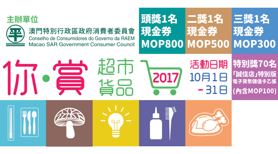 凡年滿十五歲持澳門居民身份證人士,在10月1日至31日期間使用「超市物價情報站」手機應用程式進入「你•賞超市貨品」活動頁面回答問題、填上你最想超市普查增加調查的貨品種類與款式,以及個人資料就可參加抽獎,消委會將於獲最多選擇的首三款「你最想增加的超市貨品種類」的參加投選者中抽出各個獎項的得獎者。活動設頭、二及三獎,各獲八百元、五百元及三百元的現金券,特別獎70個名額,各獲「誠信店」特別版電子貨幣儲值卡乙張(內含MOP100)。