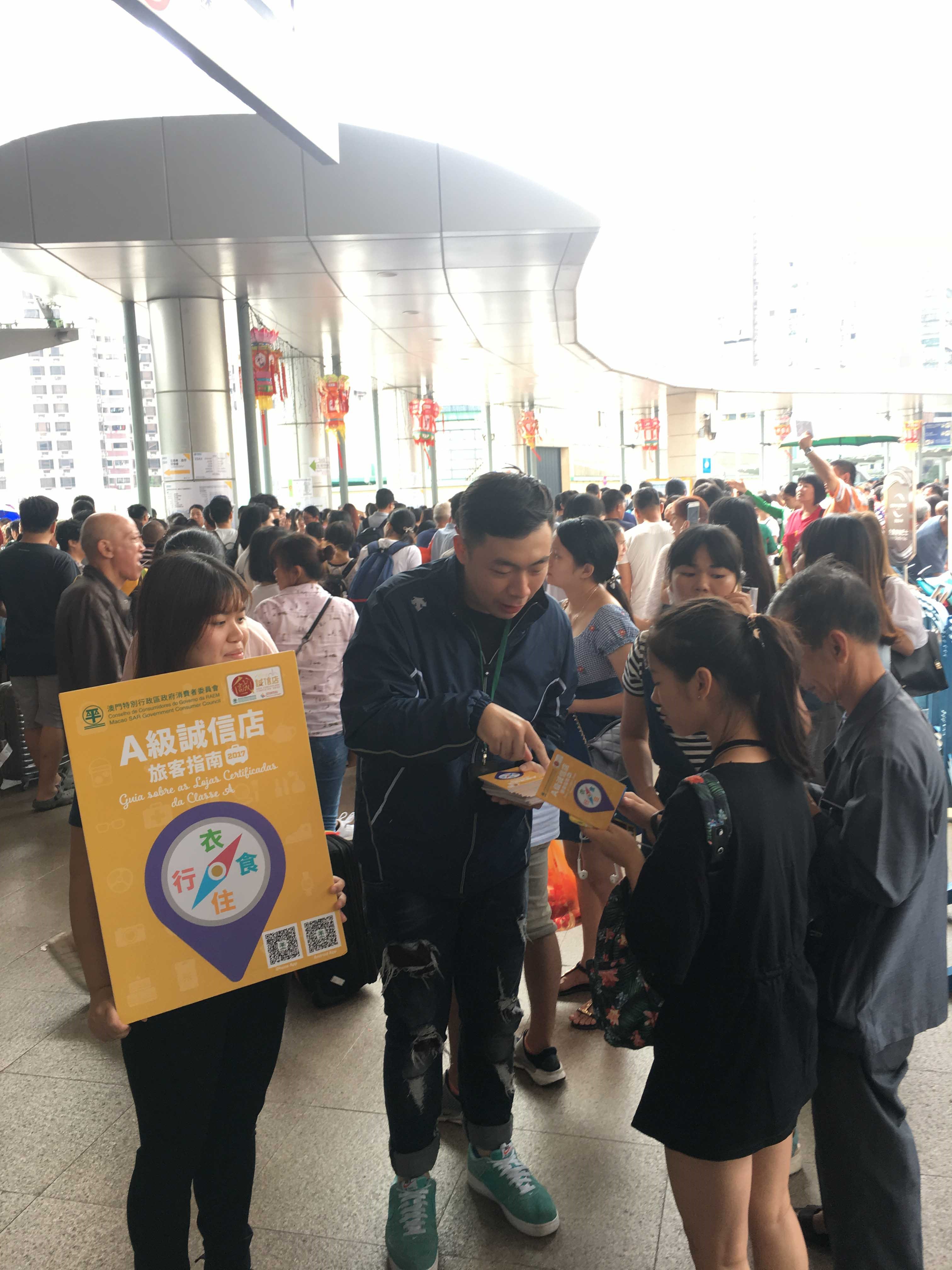 消費者委員會針對內地十‧一黃金周長假期會有大量旅客來澳旅遊消費,特別派員到各出入境口岸、各區旅遊熱點向旅客派發《A級誠信店旅客指南(2017)》,讓旅客認識“誠信店”優質標誌計劃,以及獲取更多關於“誠信店”商號的資料。