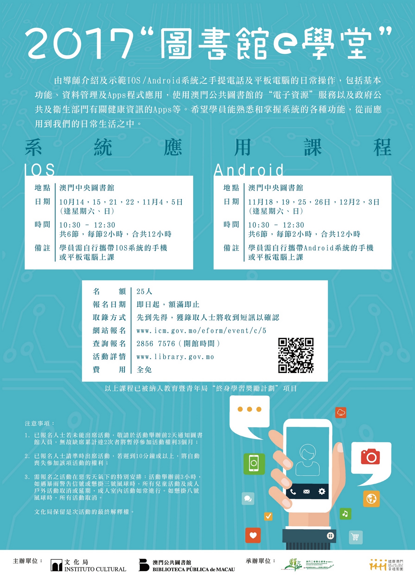 為滿足市民多元化的閲讀方式,讓市民更好的使用“電子資源”服務,文化局澳門公共圖書館將於十月至十二月舉辦“圖書館e學堂”課程,包括“IOS系統應用課程”及“Android系統應用課程”課程,歡迎有興趣市民報名參與。