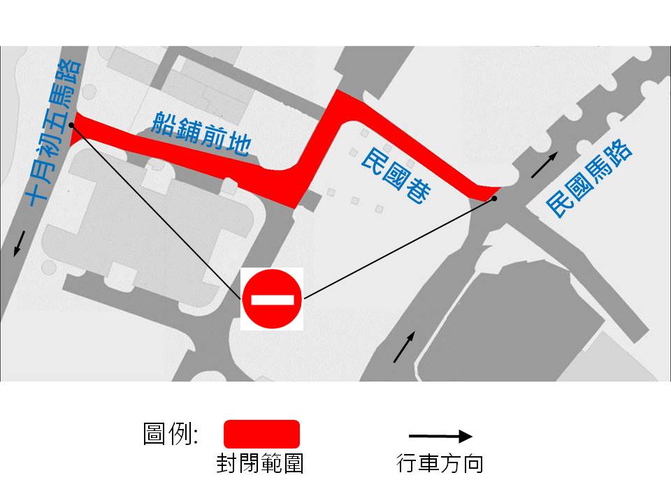 配合民政總署分階段更換路環壓力渠,由10月16日(周一)上午10時至11月16日(周四),介乎十月初五馬路與船鋪街之間一段船鋪前地;介乎民國巷與船鋪前地之間一段船鋪街及介乎民國馬路與船鋪街之間一段民國巷實施封閉交通,禁止車輛駛入。