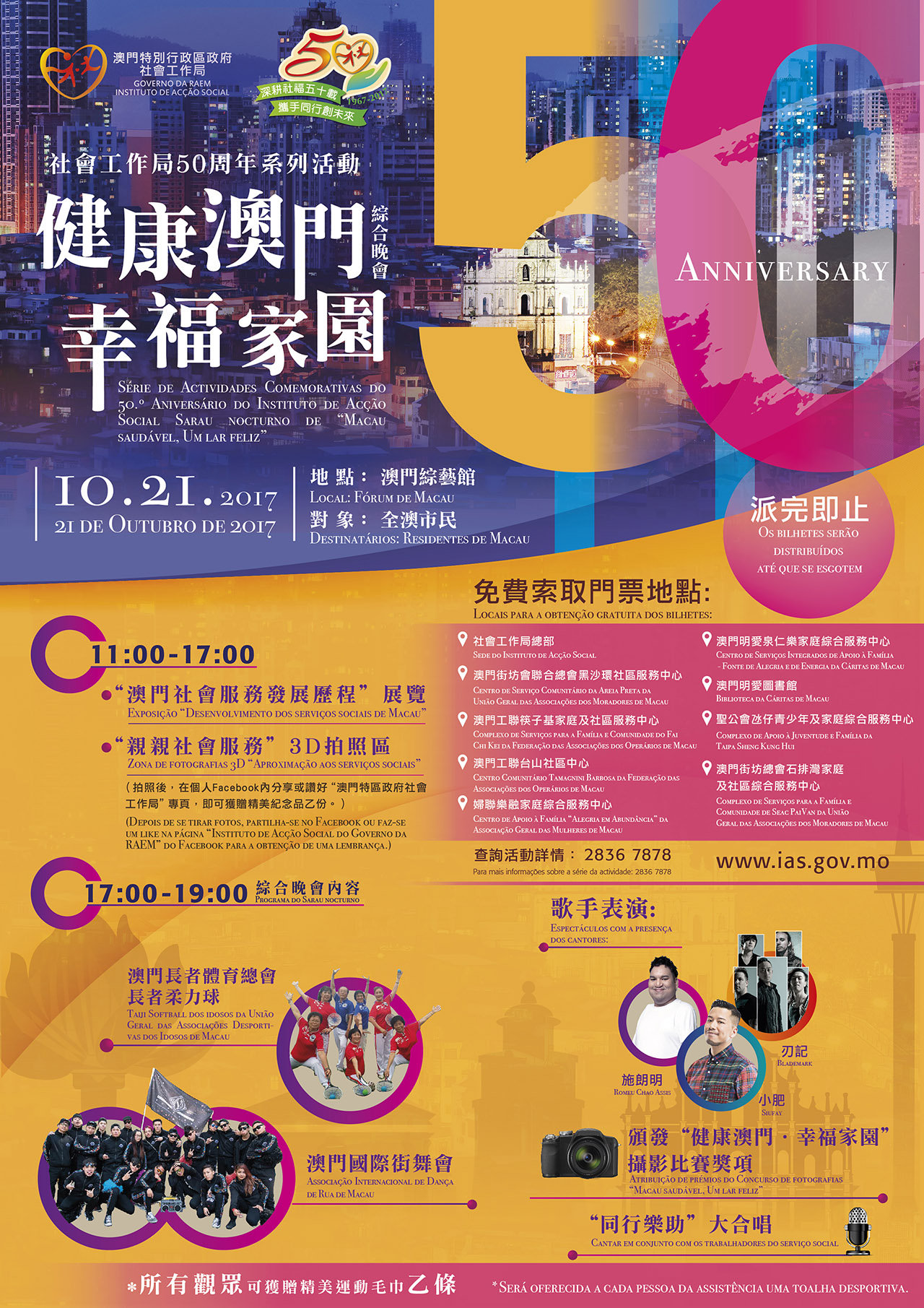 社會工作局為增進與社會服務機構人員的友好交流合作,向市民大眾分享同行樂助精神,將於10月21日(星期六)在澳門綜藝館舉行社會工作局50周年系列活動 - “健康澳門.幸福家園”綜合晚會。門票現於多個地點免費派發,歡迎市民大眾踴躍參與。