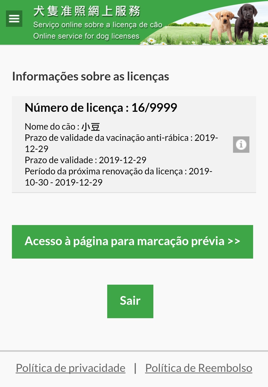 市民可登入網址https://app.iacm.gov.mo/doglicense進入“犬隻准照網上服務”,點選“查詢及預約注射狂犬病疫苗”,然後輸入犬隻的晶片編號及犬隻准照編號,即可查詢該犬的狂犬病疫苗有效日期;如要為犬隻預約注射狂犬病疫苗,只要點選“進入預約頁面”,即可連結至網上預約系統,選擇擬為犬隻預約注射狂犬病疫苗的日期。