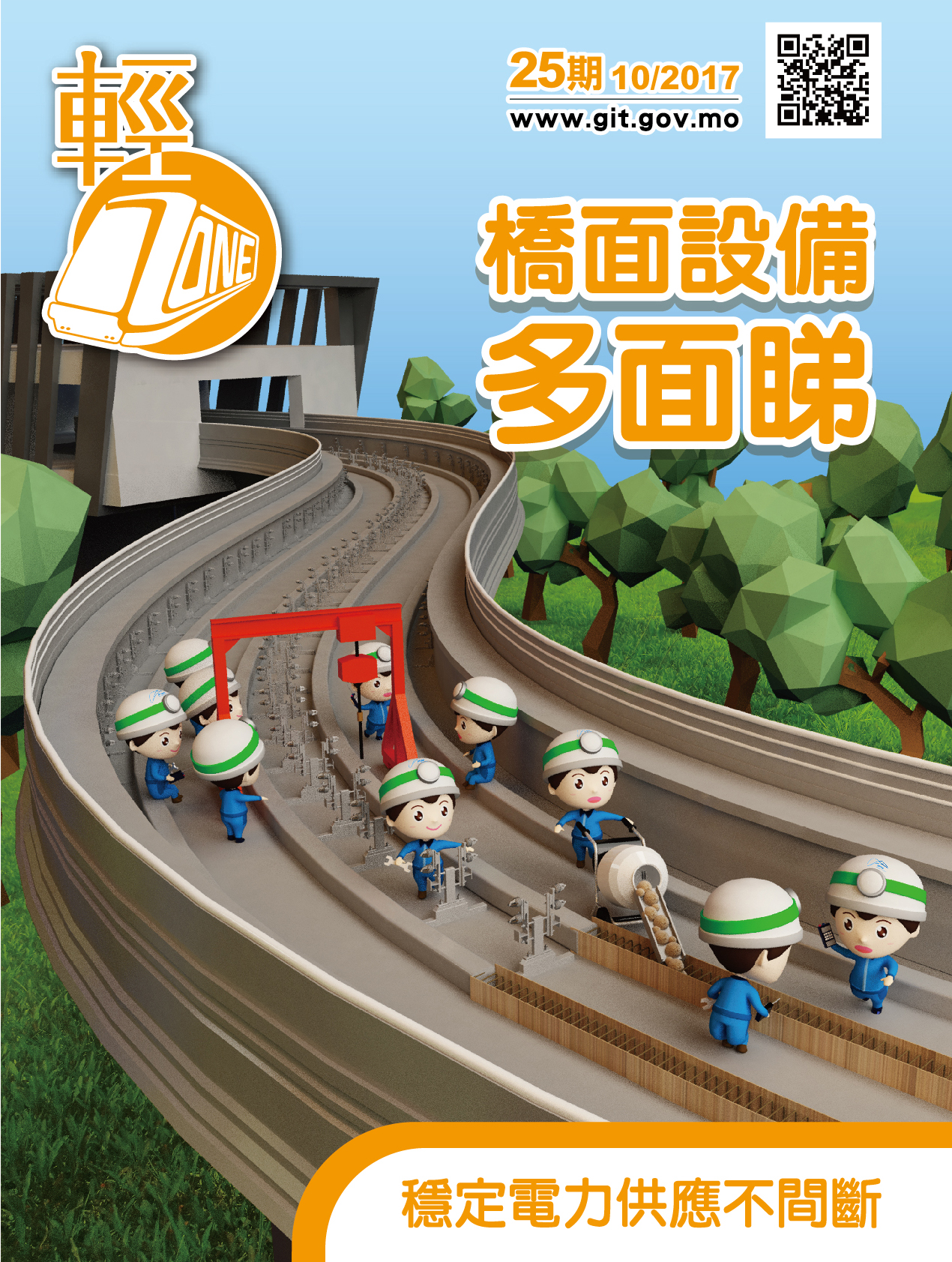 第二十五期澳門輕軌季刊《輕ZONE》經已出版!今期會帶大家到輕軌氹仔線的高架橋上看看正在安裝的系統設備!市民由即日起可於指定站點免費索取新一期季刊,或登入運輸基建辦公室網站瀏覽及下載。