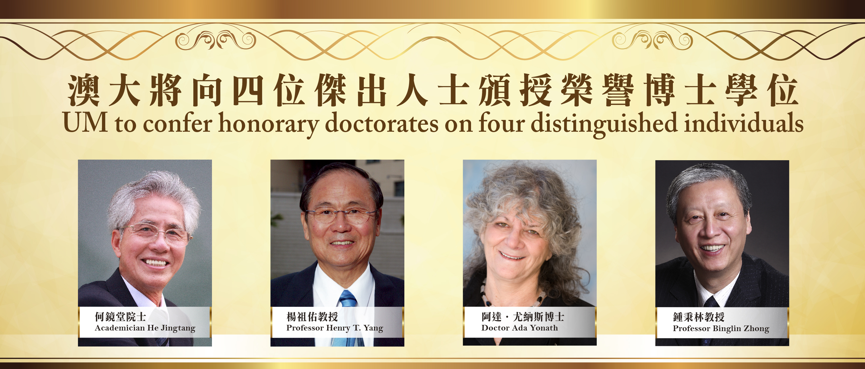 澳門大學將向4位傑出人士:何鏡堂院士、楊祖佑教授、阿達•尤納斯博士和鍾秉林教授頒授澳大榮譽博士學位,以表彰其卓越成就及為社會發展和教育做出重大貢獻。