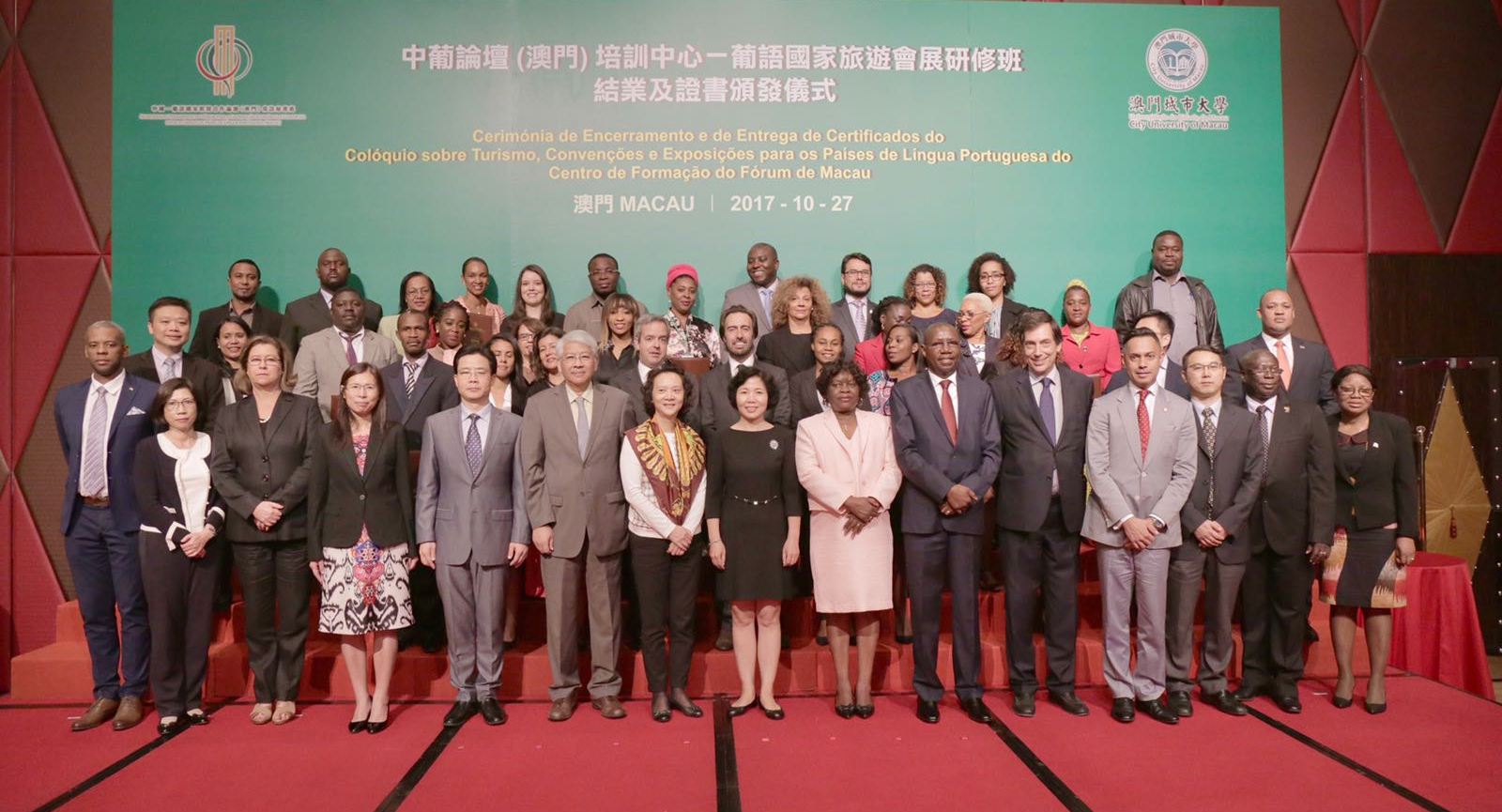 由中葡論壇(澳門)培訓中心主辦、澳門城市大學承辦的“葡語國家旅遊會展研修班”於10月27日假澳門新葡京酒店宴會廳舉行結業典禮暨證書頒發儀式。中葡論壇(澳門)常設秘書處徐迎真秘書長、中央人民政府駐澳門特別行政區聯絡辦公室經濟部陳星副部長兼貿易處負責人、安哥拉駐澳門總領事蘇菲亞‧珮嘉杜‧德西爾瓦女士、莫桑比克駐澳門總領事瑞法歐•古斯托迪奧•馬爾格斯先生、澳門城市大學張曙光校長以及論壇各葡語國家派駐代表等出席典禮。徐迎真秘書長、張曙光校長和研修班輪值班長奧斯瓦多•安東尼奧先生分別致辭。