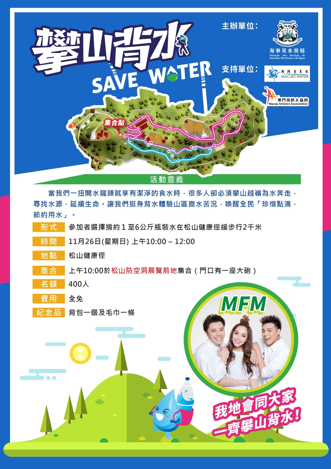 澳門的淡水資源相當匱乏,超過95%的原水來自內地,每年冬春季節更受到鹹潮威脅,內地相關單位和特區政府多年來透過上移取水點以及水量調度等一系列部署,保障了澳門的供水安全,令到居民漸漸再感受不到鹹潮影響,所以澳門居民扭開水龍頭就能享用潔淨的食水。然而,內地很多山區的人民卻必須每日攀山越嶺為水奔走,才能取得食水延續生命。珍貴的淡水資源來之不易,為使居民“有水當思無水之苦”,海事及水務局將於11月26日早上10:00在松山健康徑舉辦“攀山背水”體驗活動。參加者可按自身的能力,選擇背著約1至6公斤的食水,環繞松山健康徑步行一圈,體驗內地山區人民攀山越嶺擔水的艱辛,從而更加珍惜寶貴的水資源。