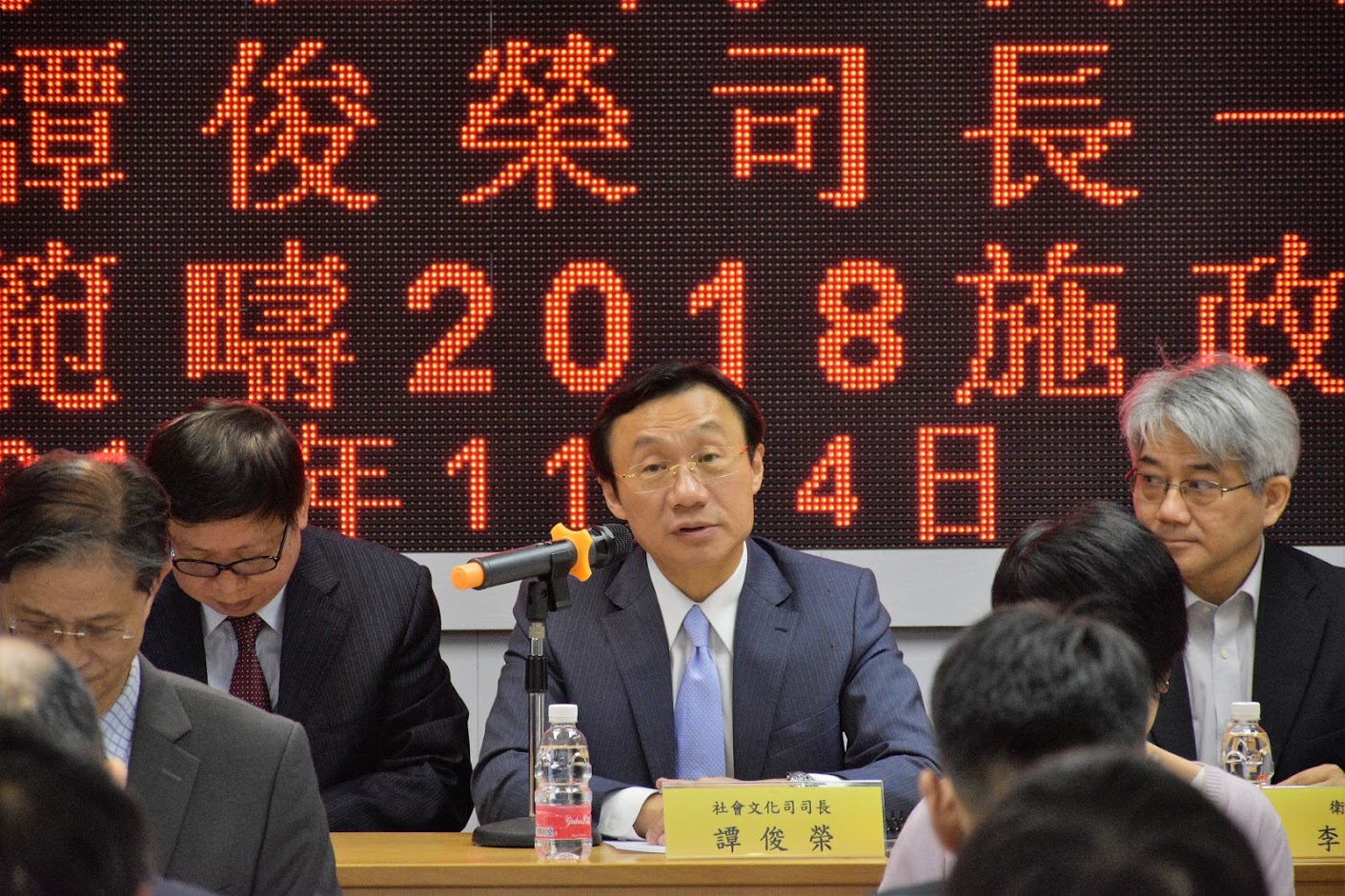 社會文化司司長譚俊榮今(4)日率轄下多個局領導及辦公室顧問,到訪澳門江門同鄉會,就社會文化範疇2018年的施政工作聽取意見。會長甄瑞權、副會長麥瑞權、鄭安庭歡迎譚俊榮等官員到訪,同鄉會領導層及骨幹成員數十人出席交流會。