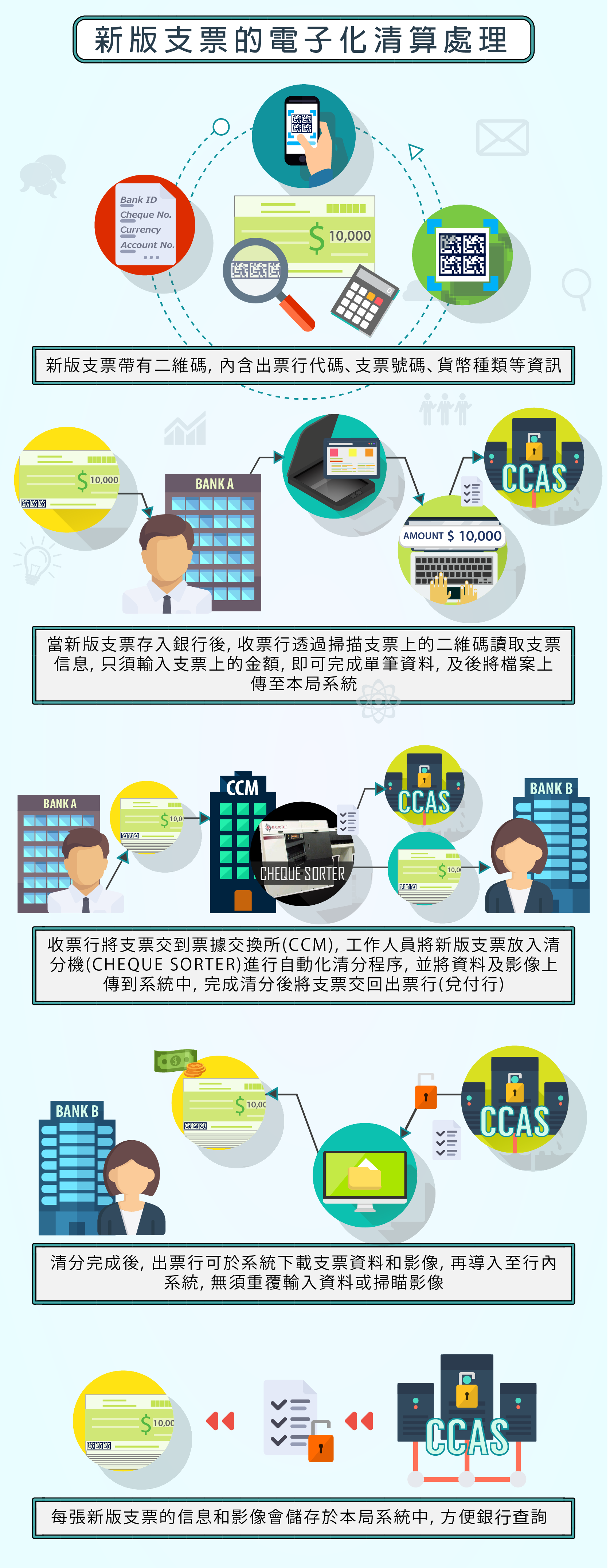 澳門票據清算電子化系統已於9月25日正式運作,現為本地27家信用機構提供票據清算的電子化服務。系統透過掃瞄新版支票上的二維碼讀取支票信息,從而進行全自動化清分,加快了清分速度和提高了準確率。目前新版支票佔總體票據量約兩成,舊式支票仍可繼續使用,銀行將有序協助客戶換領新式支票簿。下一階段,金管局將爭取實現對新版的銀行本票、禮券、政府支付憑單等電子化清算,更進一步改善銀行體系的資金流轉情況。
