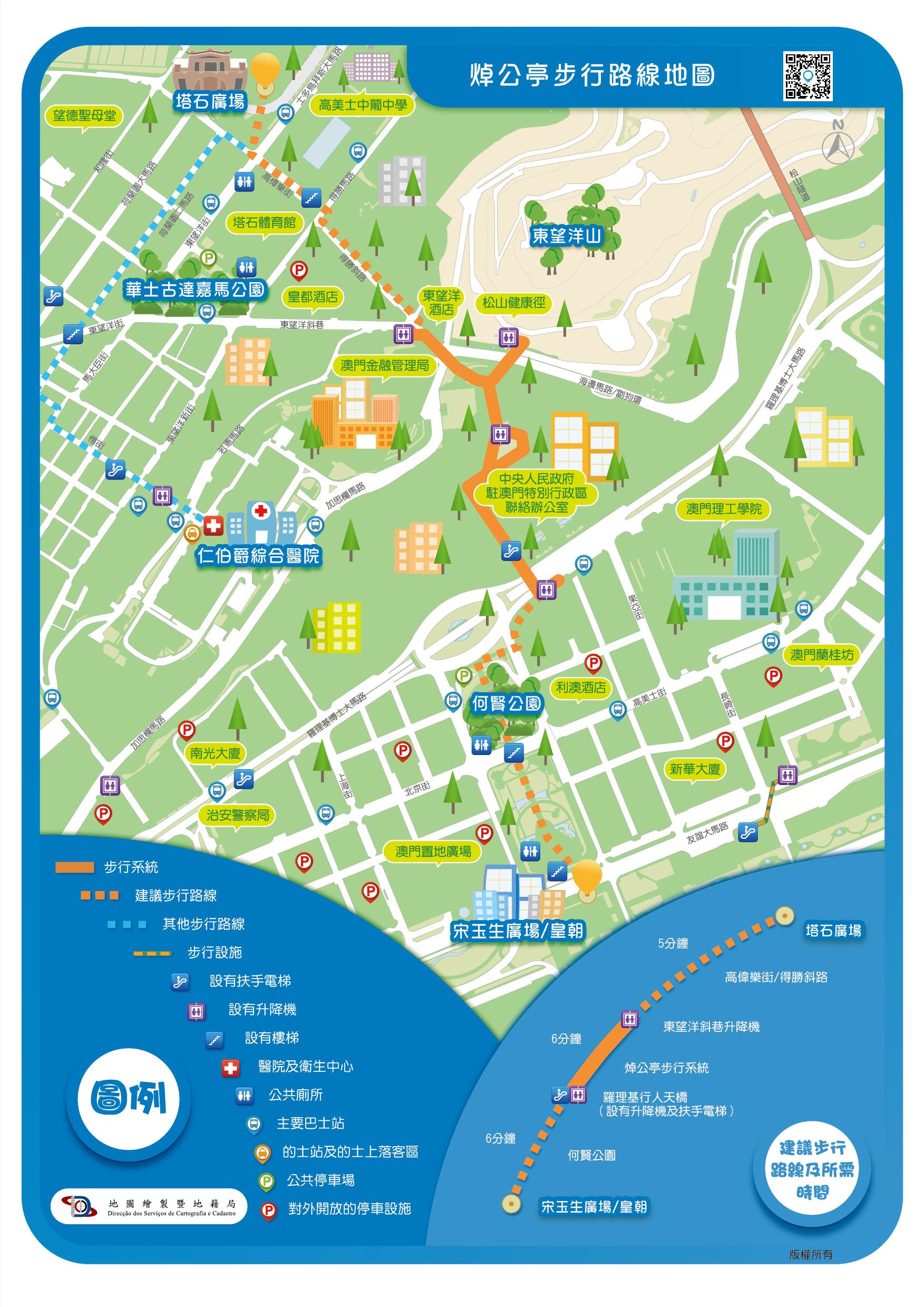 詳情可掃描以下QR CODE瀏覽步行路線專題網頁(https://routemap.dscc.gov.mo/)或於辦公時間致電28340040查詢。