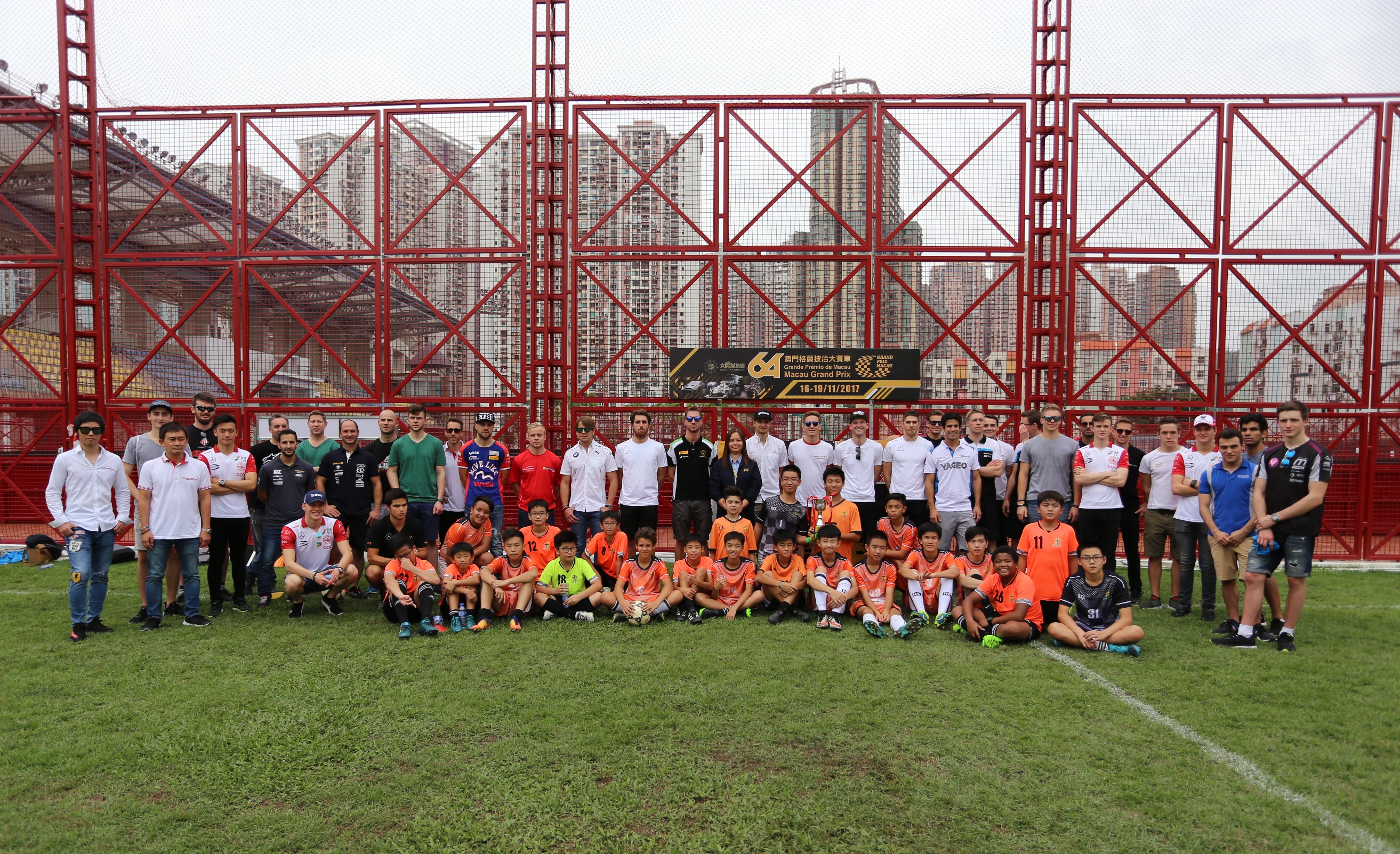 在「太陽城集團第64屆澳門格蘭披治大賽車」前夕,四大主要賽事的一眾車手從賽道轉戰球場,與澳門的學生在奧林匹克體育中心進行射球友誼賽。