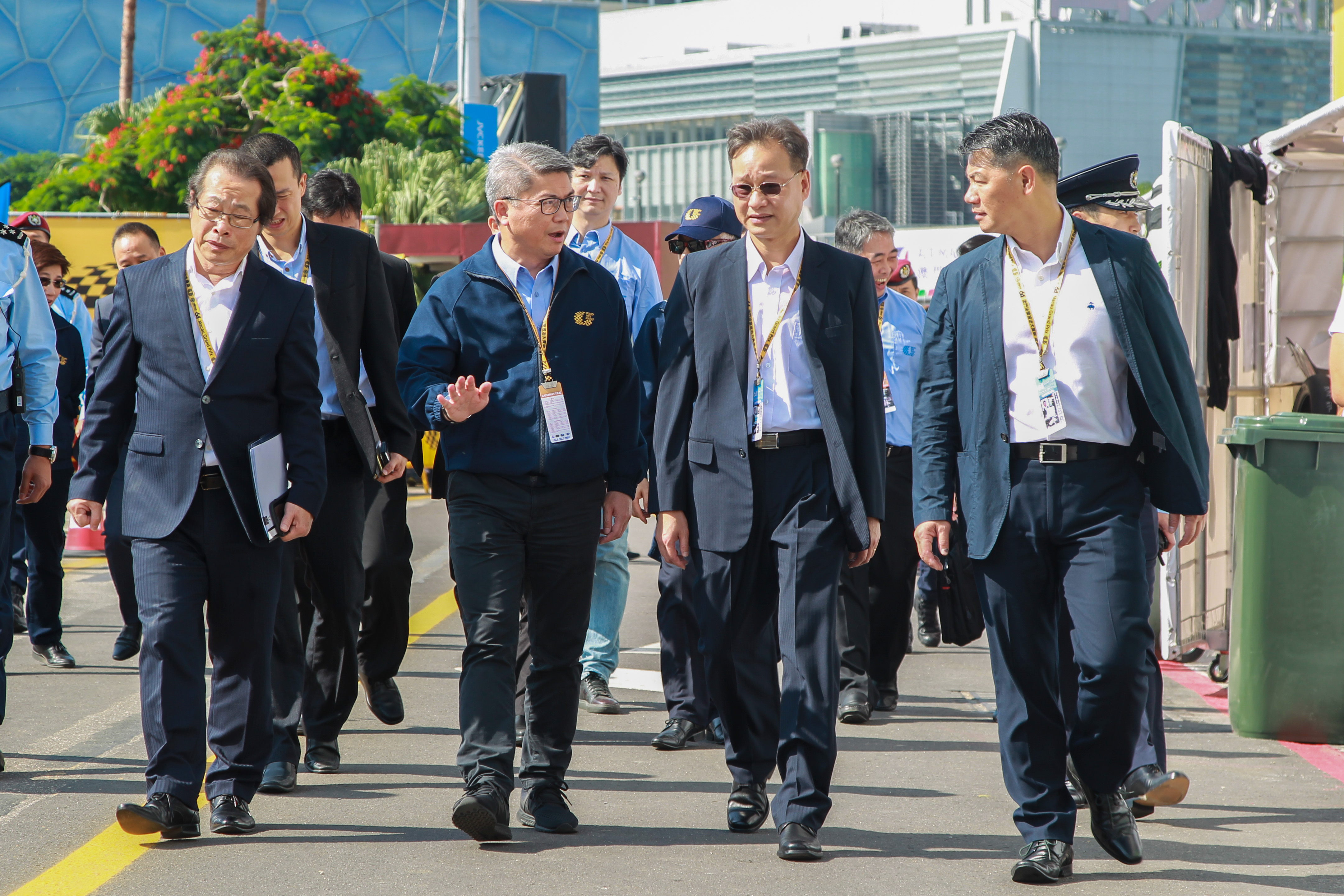 今日上午,警察總局馬耀權局長到格蘭披治賽車大樓聽取治安警察局梁文昌局長、各領導主管及大賽車保安工作負責人的工作報告並作出指示,以及聯同大賽車組委會協調員潘永權局長、治安警察局梁文昌局長等一眾負責人巡視了各項設施,為現場工作人員打氣。梁文昌局長與各領導主管亦到賽道周邊巡視,了解人流及車流情況。