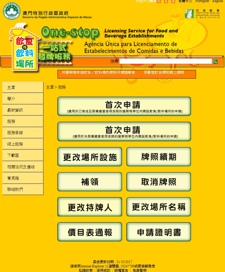 近期亦新增設“網上辦理飲食及飲料場所牌照續期服務”,持牌人只須於民署轄下的服務中心申請其專用的網上帳戶後,便可透過一站式發牌服務專題網頁www.iacm.gov.mo/onestop-fnb登入系統,填妥簡單的資料及上載所需文件即可辦理續期。