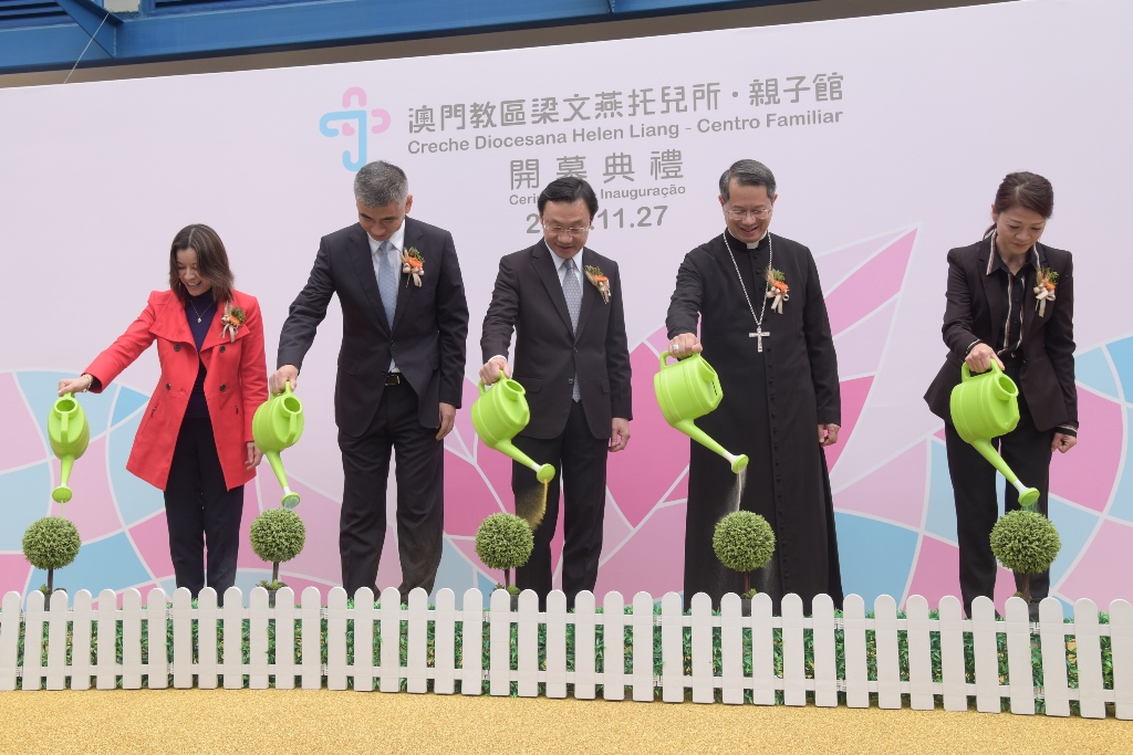 社會文化司譚俊榮司長、中聯辦社會工作部戴儒鳴副部長、天主教澳門教區李斌生主教、社工局黃艷梅局長及澳門教區梁文燕托兒所劉小玲院長以植樹澆灌的方式,為澳門教區梁文燕托兒所及親子館主持啟動儀式,象徵幼兒茁壯成長。