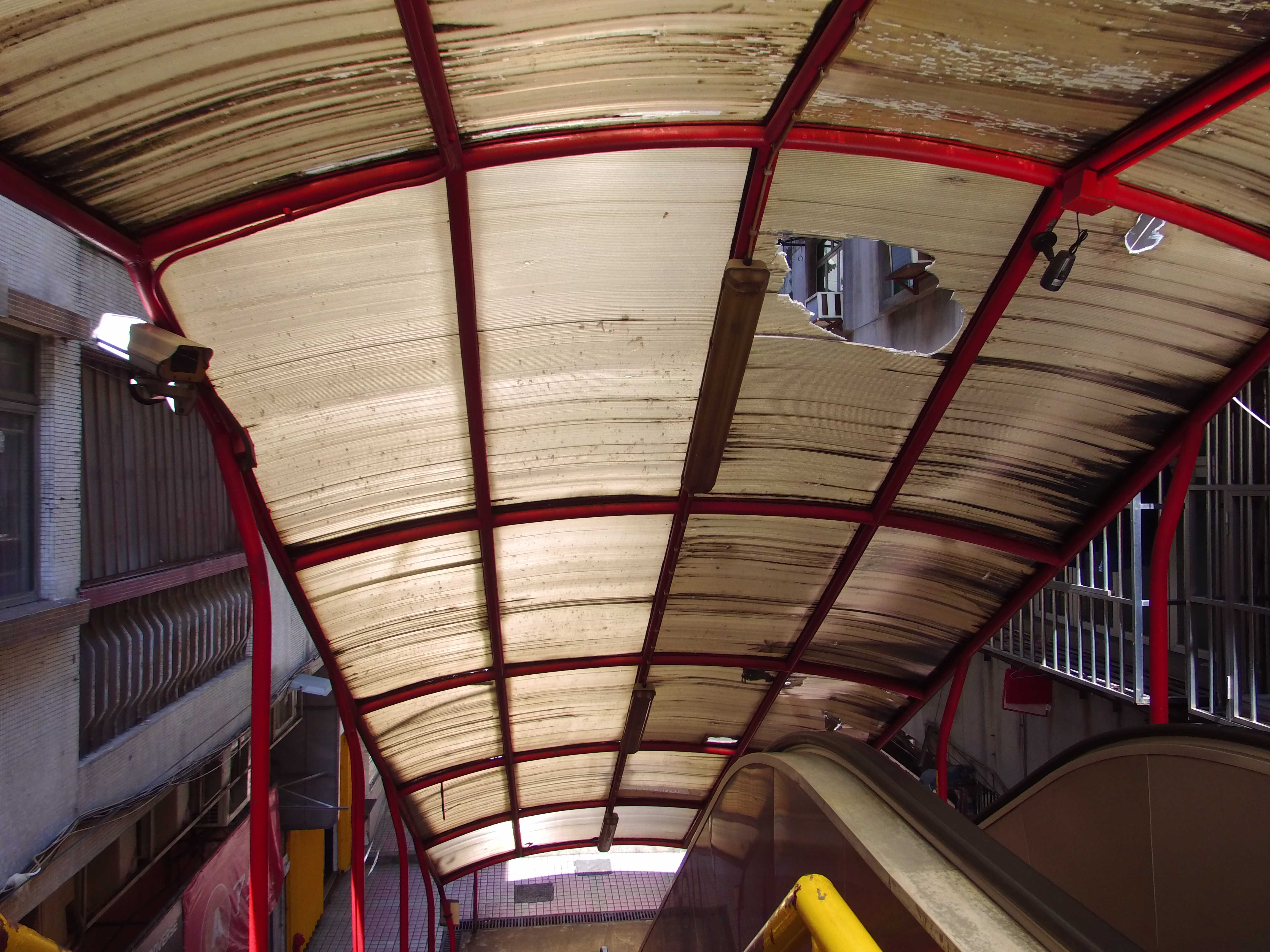 由於上述行人天橋使用頻繁,部分構件如樓梯級、鋪面鐵板及頂蓬等已出現生銹剝落等不同程度損壞,有需要進行維修保養。為回應市民訴求及保障使用者安全,民署開展天橋維修工程,主要更換天橋鋼板地台並鋪設防滑鋼沙、更換天橋頂蓬及雨水槽、清潔整座天橋、清除金屬結構的浮銹、污垢及現有油漆,以及重新塗髹油漆等。
