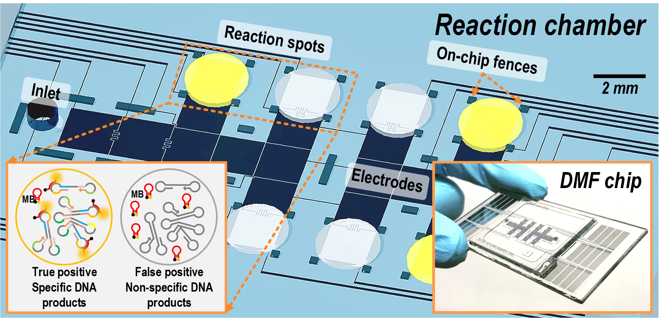 該研究題為“可實現環介導恒溫擴增與特異性病原檢測的數位微流系統",由澳大模擬與混合信號超大規模集成電路國家重點實驗室(AMSV)微流控研究小组的萬諒、陳天藍、高潔、董鋮、賈艷偉(通信作者)、麥沛然和馬許願,與澳大健康科學學院研究人員王衡馨和鄧初夏跨領域合作進行。相關研究獲澳門科學技術發展基金(FDCT)資助。澳大AMSV微流控研究小組以“數位微流控"為核心技術,並結合生化學微流控技術、細胞培養與藥物篩選的微流控系統、疾病診斷的自動化便捷式醫療設備等作研究方向。該研究小組於2015年建澳大首間“千級無塵潔淨室",佔地約60平方米,內設可實現Soft lithography、Nanodeposition等工藝的精密儀器,上述工藝是製造“數位微流控晶片"的關鍵步驟。該檢測工具運用數位微流控技術(Digital Microfluidics),即以“電潤濕"原理,利用電壓信號驅動納升至微升的液滴在微型晶片上自由移動,從而大幅減少反應容積與時間,使其極容易發展為可擕式檢測裝置,供床邊檢驗(Point-of-care testing)。另外,也運用“環介導恒溫擴增"(Loop-mediated isothermal amplification)方法,即在恒溫情況下短時間進行大量DNA複製,所需設備簡單,為臨床分子檢測優良之選。