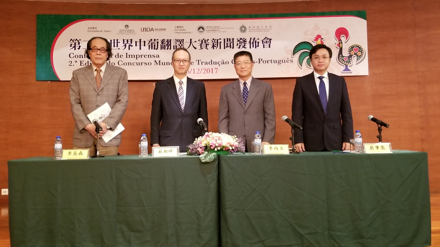 第二屆世界中葡翻譯大賽新聞發佈會12月6日(星期三)下午四時在澳門理工學院舉行,由高等教育輔助辦公室蘇朝暉主任、澳門理工學院院長李向玉教授、澳門理工學院副院長嚴肇基教授及第二屆世界中葡翻譯大賽學術組組長李長森教授主持,介紹比賽章程及詳情。蘇朝暉主任在新聞發佈會上指出澳門作為中葡雙語人才培訓基地,高等教育輔助辦公室一直支持澳門的高等院校推動中葡雙語人才。去年在理工學院的倡議下,聯手舉辦首屆世界中葡翻譯大賽,成績有目共睹。蘇朝暉主任期望第二屆世界中葡翻譯大賽能夠吸引更多隊伍參賽,再創佳績。李向玉院長致辭時表示澳門理工學院一直著力於中、葡雙語翻譯的教學工作,舉辦中葡翻譯大賽是為了加強世界範圍內高等院校學生之間中葡語言翻譯技術的交流、更好地培養中葡翻譯專才、發揮中葡翻譯“百年老校”的優勢,為葡語的教學和推廣做出應有的貢獻。李向玉教授預祝第二屆世界中葡翻譯大賽圓滿成功。