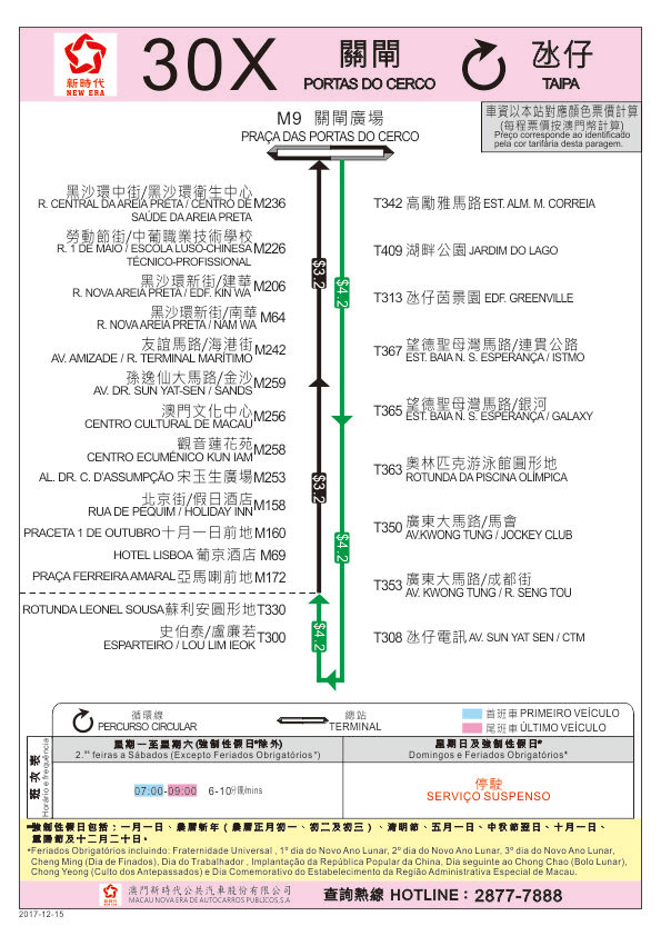 為加強行車安全及擴大服務範圍,由12月15日(周五)首班車起,3A及30X巴士路線調整停靠站點,包括取消停靠“馬場東大馬路”巴士站,新增停靠“勞動節街/中葡職業技術學校”及“黑沙環中街/黑沙環衛生中心”站,交通事務局呼籲乘客留意。