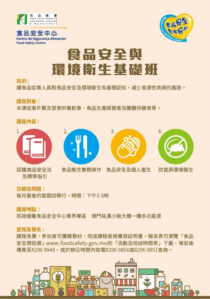 民政總署食品安全中心於2018年推出新版的“食品安全與環境衛生基礎班”,教學內容尤其切合餐飲食肆及外賣店舖需要,積極支援行業發展。課程每月恆常舉辦,課時約兩小時,費用全免,歡迎業界及公眾報讀,完成課程者可獲發證明書。