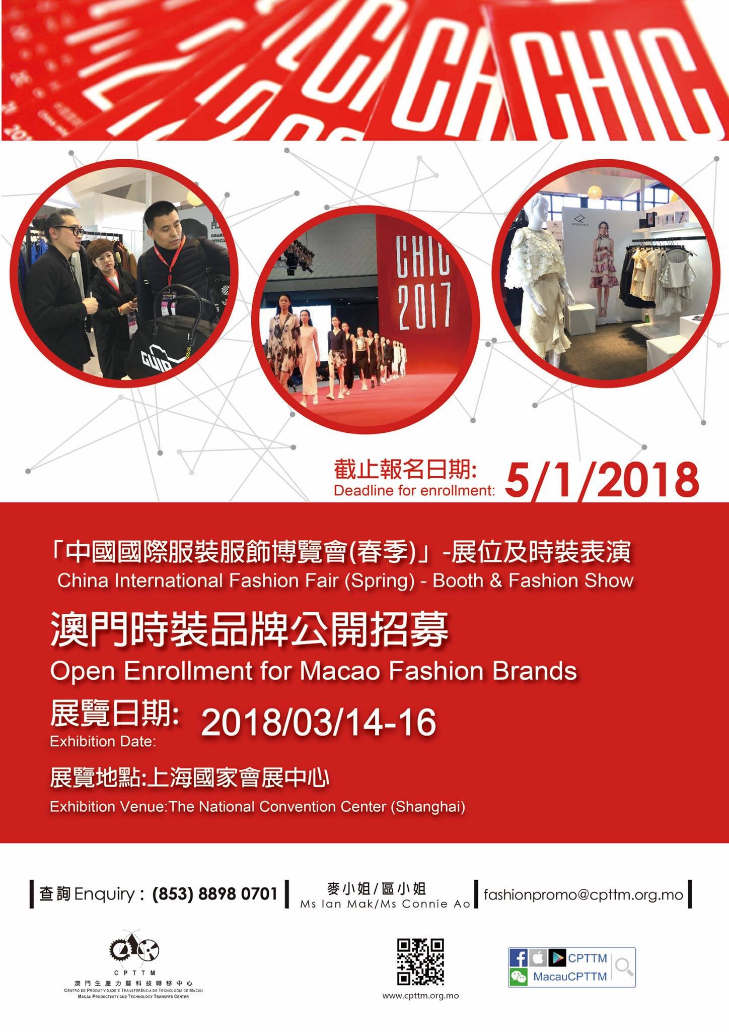 澳門生產力暨科技轉移中心將於2018年3月14-16參與“2018年中國國際服裝服飾博覽會(CHIC)上海春季”,現進行公開招募,歡迎本澳時裝品牌或時裝設計師參加。