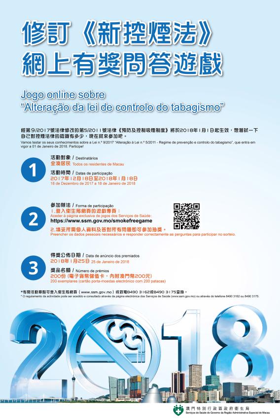 經第9/2017號法律修改的第5/2011號法律《預防及控制吸煙制度》已於今年1月1日正式生效。為了讓公眾認識《新控煙法》及法律修訂的內容,衛生局於2017年12月18日至2018年1月18日期間舉辦“修訂《新控煙法》網上有獎問答遊戲”,歡迎本澳居民踴躍參與。