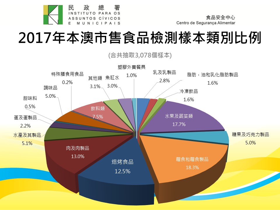 民政總署食品安全中心持續透過恆常的食品監察及檢測機制,評估市售食品的風險及衛生狀況。食安中心在二○一七年第四季抽取了五百六十二個食品樣本進行檢驗,當中有一個樣本未能通過檢測。二○一七年全年,在市面合共抽取了三千零七十八個食品樣本,整體合格率達百分之九十九以上。