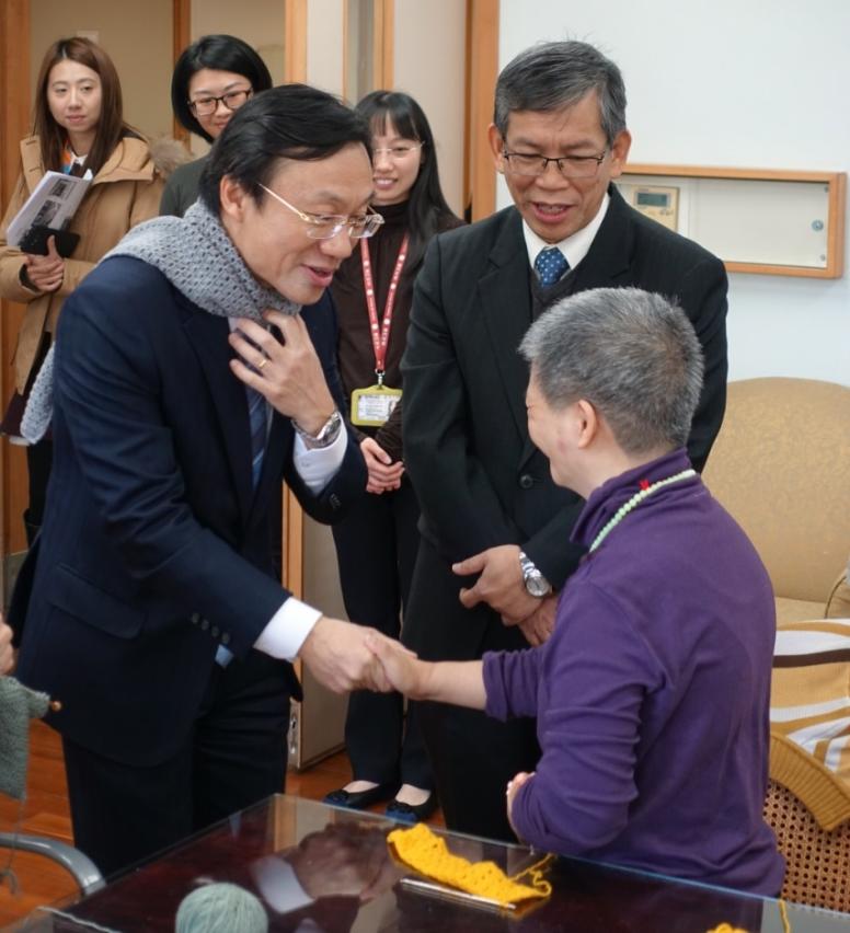 譚俊榮參觀了各間院舍的房間、治療室、活動室等,了解院友的起居生活和康復訓練情況;又觀看了院友烘焙餅乾、繪畫、勞作、表演太極扇、編織、收割農作物等情況,了解院友的多元技能和藝術才華。期間,院友向譚司長致送親手製作的紀念品,譚司長並立即戴上院友送贈的手織頸巾,場面十分溫馨。