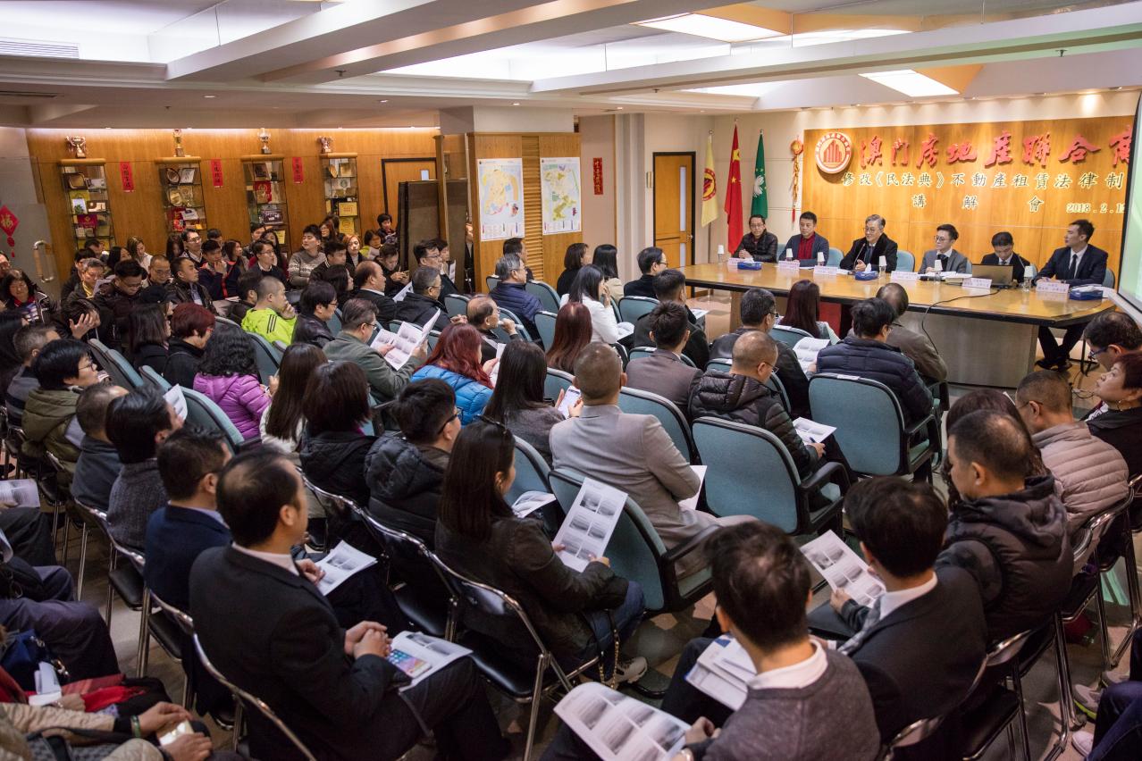 為了讓地產中介從業員了解將於2018年2月18日生效的第13/2017號法律《修改〈民法典〉不動產租賃法律制度》,法務局、房屋局、澳門房地產聯合商會合辦專題講解會。
