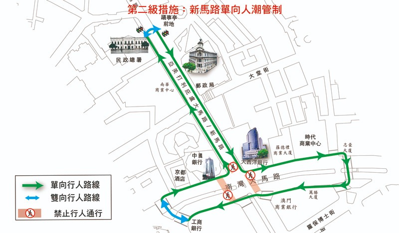 當第一級措施未能解決人群持續擠擁問題時,在第一級的基礎上,新馬路將實施單向人潮管制。行人需遵照附圖所示‘倒T’字型單向行進路線前往議事亭前地、大西洋銀行、滙豐銀行、商業銀行、工商銀行、中國銀行及民政總署等地點。