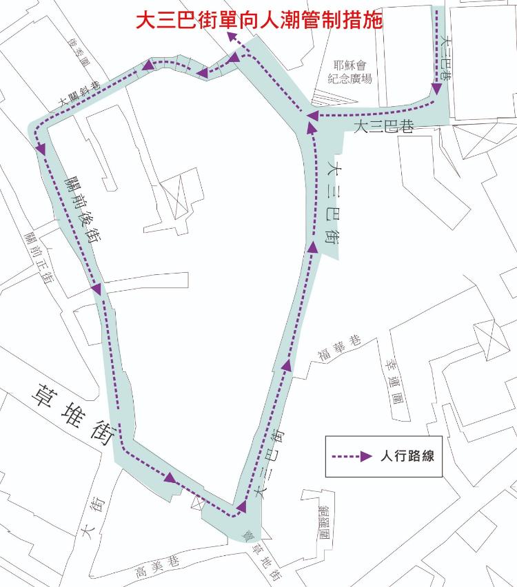 當大三巴街(手信街)人群出現擠擁時,將會實施單向人潮管制措施,人流只可單向上行往牌坊,並取道周邊的街巷如大關斜巷、關前後街、高園街等離開。