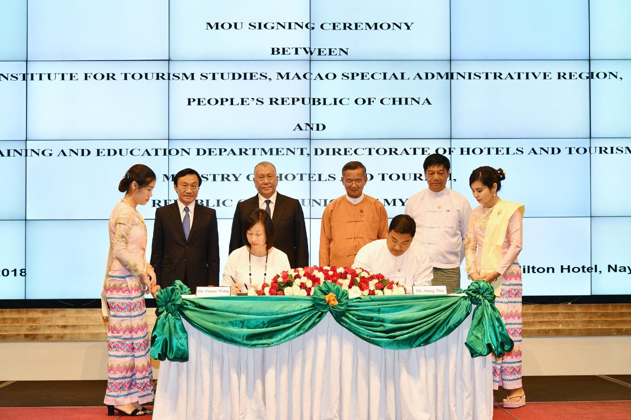 在內比都期間,全國政協副主席何厚鏵、緬甸聯邦共和國飯店與旅遊部部長、澳門特別行政區社會文化司司長譚俊榮一同見證澳門旅遊學院與緬甸飯店與旅遊局培訓和教育部簽署諒解備忘錄。