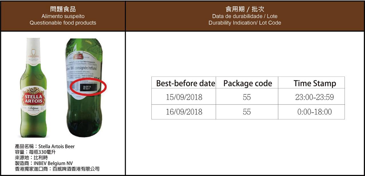 民署食安中心透過恆常食品事故監察系統,獲悉香港代理商「百威啤酒香港有限公司」正回收兩批次來原地均為比利時的“Stella Artois”啤酒,每瓶容量為330毫升;產品製造商為INBEV Belgium NV。