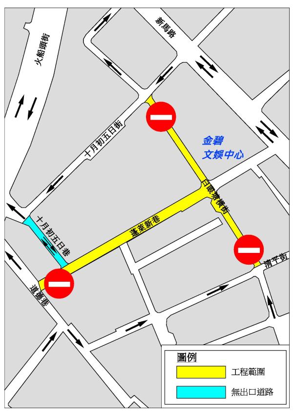 配合鋪設水管、電纜及管道工程,介乎清平街與十月初五日街的一段白眼塘橫街,及介乎白眼塘橫街與道德巷的一段蓬萊新巷於5月14日(周一)至6月7日(周四)臨時封閉交通;而介乎蓬萊新巷與十月初五日街的一段十月初五日巷臨時改為無出口道路,交通事務局呼籲駕駛者留意。