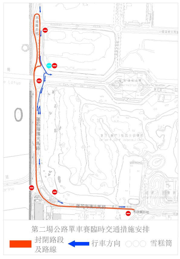介乎西堤圓形地與和諧圓形地之間的一段蓮花海濱大馬路靠海一側車行道,即由和諧圓形地往奧林匹克游泳館圓形地方向禁止車輛通行 |