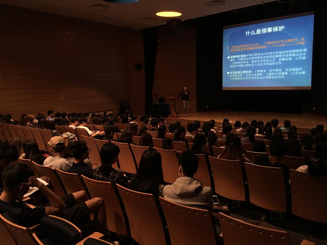 講座中,劉玉飛主任介紹了我國外交部領事司在領事保護與領事服務的主要工作,以及駐外國領事館如何協助中國公民解決在國外遇到各種不同的事故和問題,如何保護中國公民在國外的合法權益;同時也提醒學生身在外地時必須遵守當地法律,尊重當地宗教禮節和文化等。她分享了多年駐外國領事館的工作,依法保障中國公民安全的案例;此外,她還介紹了當某些國家發生自然災害或局勢動蕩時,我國外交部曾多次起動了大規模撤離當地中國公民和華僑的緊急措施,在國際上贏得了高度的讚賞,體現出國家的國力越來越強大,以及在國際上突出大國外交的力量。她以通俗易懂的方式,詳細講解了領事保護知識,呼籲學生們在國外時需防範各類安全風險和提高防範意識,並向學生們推介了外交部全球領事保護與服務應急呼叫中心及熱線電話。