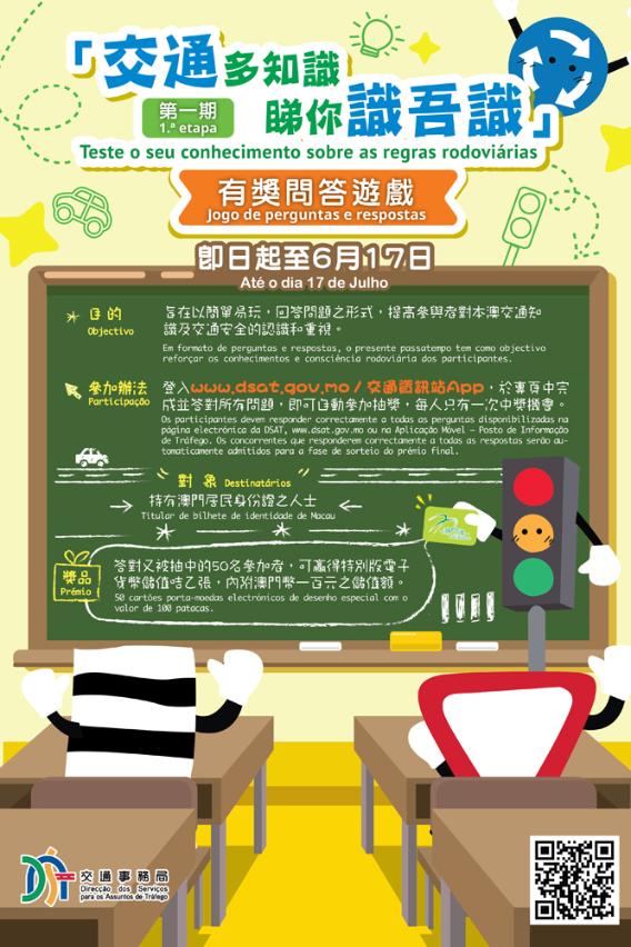 交通事務局推出第一期「交通多知識 睇你識吾識」有獎問答遊戲,由即日至6月17日,市民可登入交通事務局網頁www.dsat.gov.mo或交通資訊站手機應用程式填寫答案及報名,答對所有問題又被袖中者,可獲內附澳門幣100元之特別版電子貨幣儲值咭一張,得獎名額50名,歡迎市民踴躍參與。