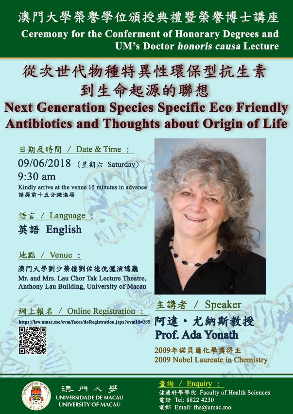 澳門大學將於6月9日舉行“澳大榮譽學位頒授典禮暨榮譽博士講座”,向諾貝爾化學獎得主阿達尤納斯教授(Prof Ada Yonath)頒授榮譽理學博士學位,以表彰其對生物醫學界的貢獻。此外,尤納斯教授將以“從次世代物種特異性環保型抗生素到生命起源的聯想"為題進行演講。歡迎有興趣人士參與。