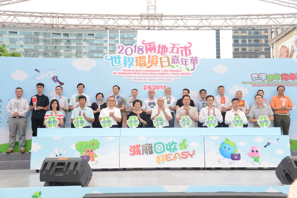 環境保護局聯合兩地五市環保部門舉辦的“2018兩地五市世界環境日嘉年華”今日(2日)下午假友誼廣場舉行,透過一系列舞台活動、攤位遊戲、環保工作坊等向社會宣揚減廢回收等環保訊息。